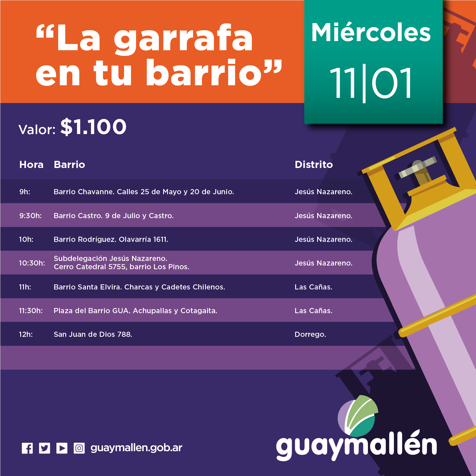 La Municipalidad de Guaymallén informa la agenda semanal de recarga de gas envasado. Las garrafas de 10 kg se pueden adquirir al precio oficial de $1.100, establecido por la Secretaría de Energía de la Nación.