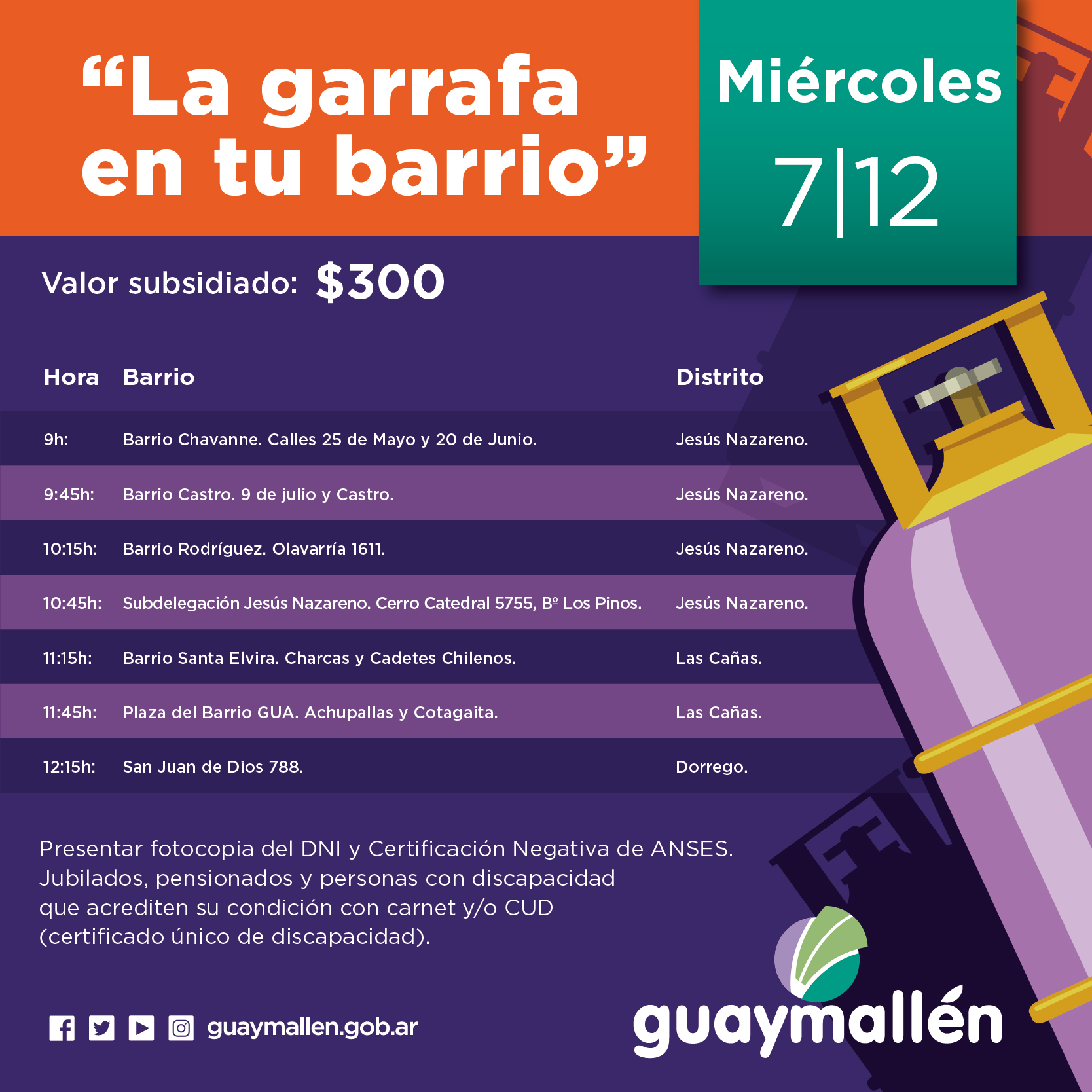 La Municipalidad de Guaymallén informa que los vecinos podrán comprar hasta dos garrafas de 10 kg a $300, con subsidio municipal. Para acceder a dicho beneficio, deben presentar fotocopia del DNI y Certificación Negativa de ANSES. Este operativo también incluye a jubilados, pensionados y personas con discapacidad que acrediten su condición con carnet y/o CUD (certificado único de discapacidad).