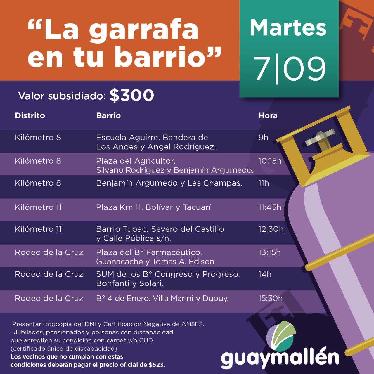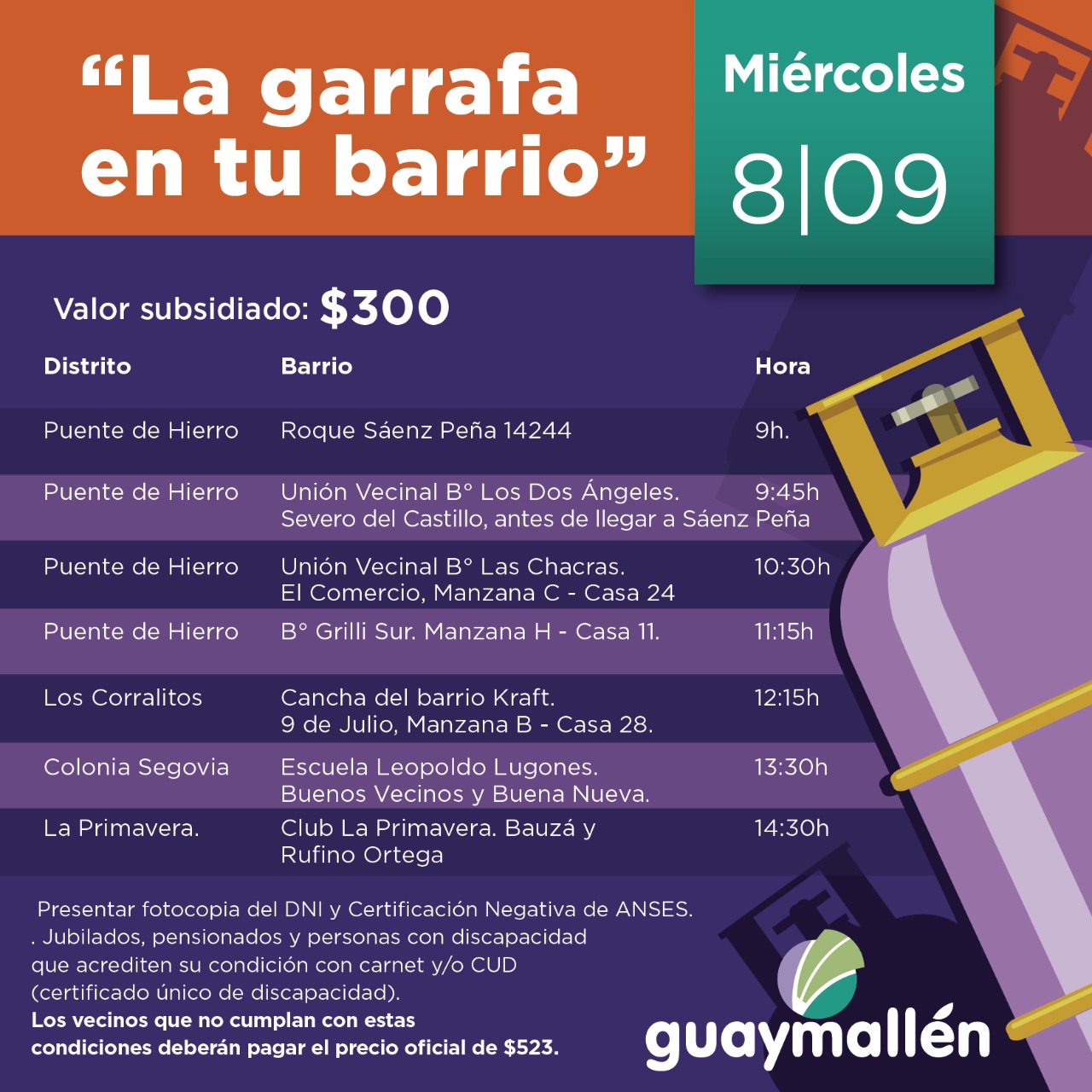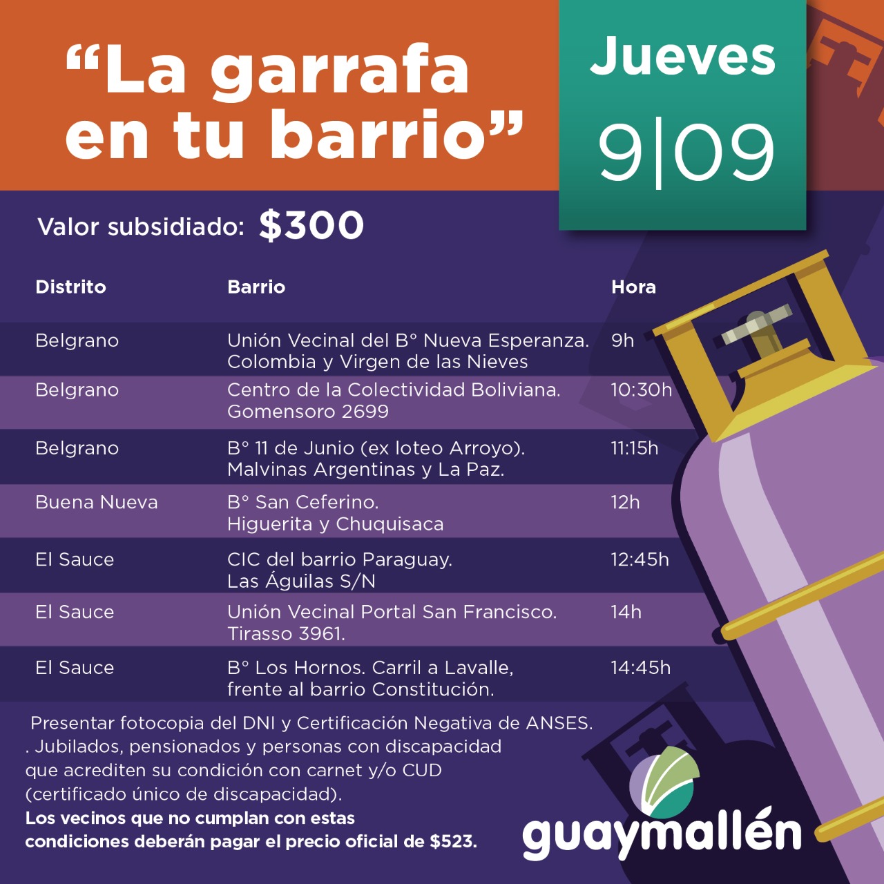 Los días 6, 7, 8 y 9 de septiembre, los vecinos podrán adquirir hasta dos garrafas de 10kg a $300, gracias a un subsidio municipal. Para acceder a dicho beneficio, deberán presentar fotocopia del DNI y Certificación Negativa de ANSES. La propuesta se amplía a jubilados, pensionados y personas con discapacidad que acrediten su condición con carnet y/o CUD (certificado único de discapacidad).