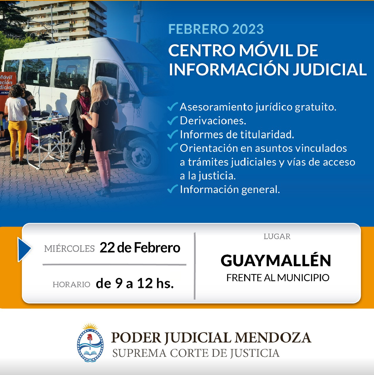 El Centro Móvil de Información Judicial atenderá al público frente a la explanada municipal (Libertad 720, distrito Villa Nueva), el miércoles 22 de febrero, de 9 a 12h.