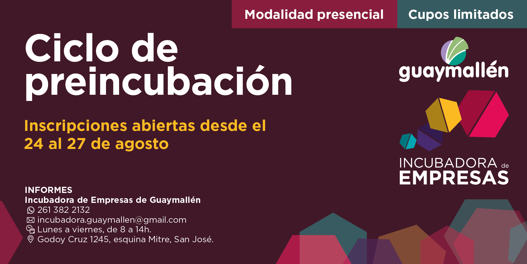 Para mayor información, pueden comunicarse con la Incubadora de Empresas de Guaymallén a través del 2613822132 o vía mail a incubadora.guaymallen@gmail.com