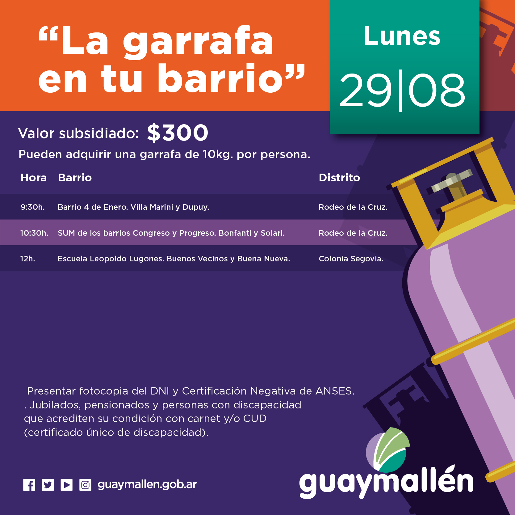 Teniendo presente que la provisión de gas envasado con subsidio municipal se vio limitada por disposiciones de la Secretaría de Energía de la Nación, al fijar cupos de recarga menores a la demanda de los sectores más vulnerables, los vecinos de Guaymallén podrán comprar solo una garrafa subsidiada de 10 kg. a $300.