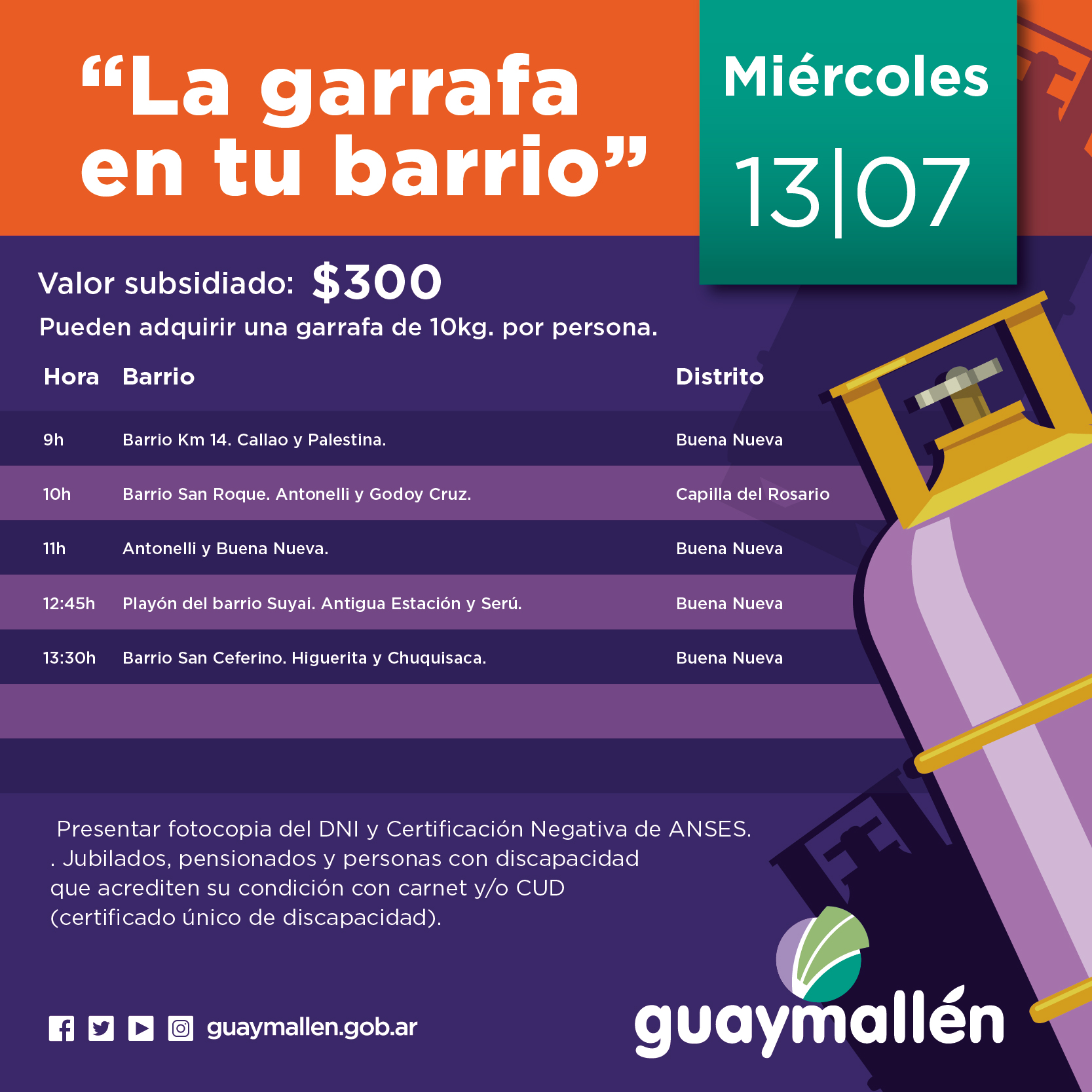 La Municipalidad de Guaymallén reitera que la provisión de gas envasado con subsidio municipal se ha visto restringida por disposiciones de la Secretaría de Energía de la Nación, al fijar cupos de recarga inferiores a la demanda de los sectores más vulnerables. Por este motivo, los vecinos podrán adquirir por familia solo una garrafa subsidiada de 10 kg. a $300, en lugar de dos como se venía realizando.