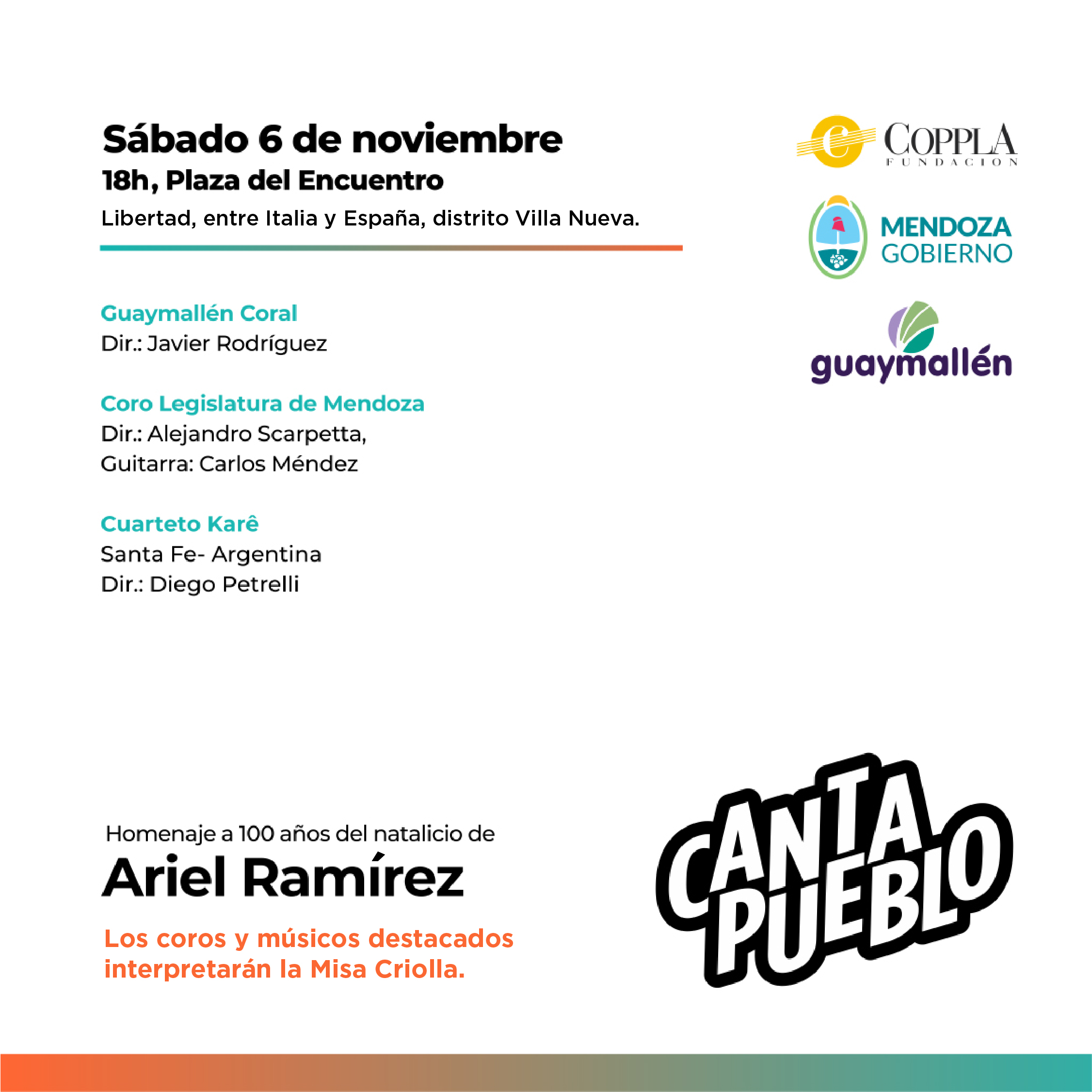 Este sábado 6 de noviembre, la música en vivo colmará la Plaza del Encuentro en el marco de una nueva edición de Cantapueblo. Ese día, a las 18h y con entrada gratuita, se presentarán el Cuarteto Karé, dirigido por Diego Petrelli; el Coro de la Legislatura de Mendoza, a cargo de Alejandro Scarpetta; y Guaymallén Coral, con dirección de Javier Rodríguez.