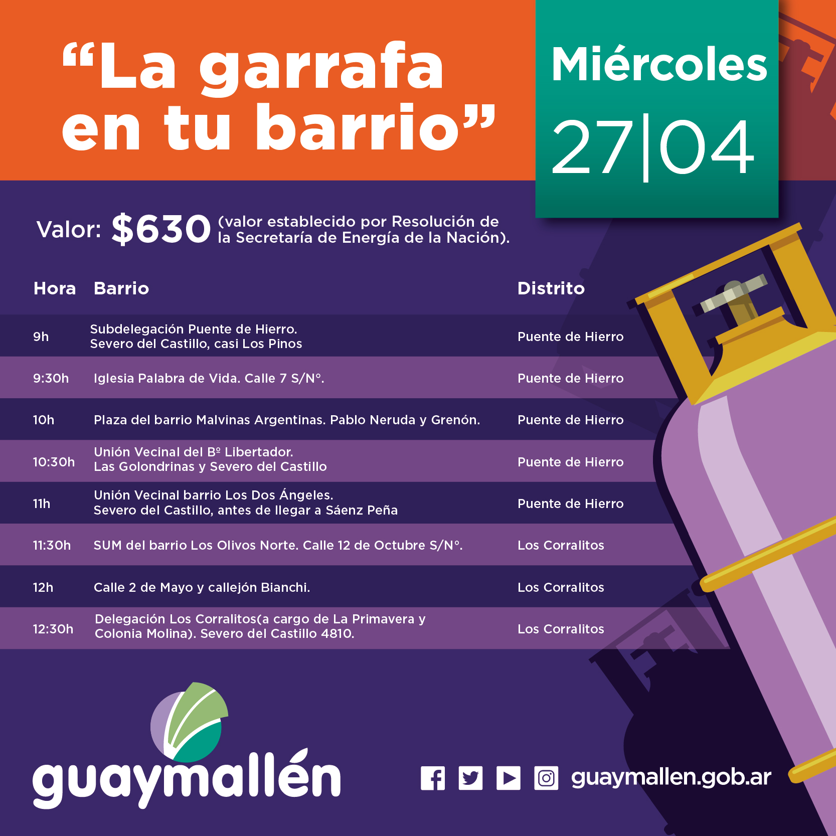 La Municipalidad de Guaymallén informa el cronograma de venta directa de gas envasado durante los días martes 26, miércoles 27 y jueves 28 de abril en diferentes puntos del departamento. Las familias podrán adquirir garrafas de 10 kg. al precio oficial actualizado de $630 (valor establecido por Resolución de la Secretaría de Energía de la Nación).