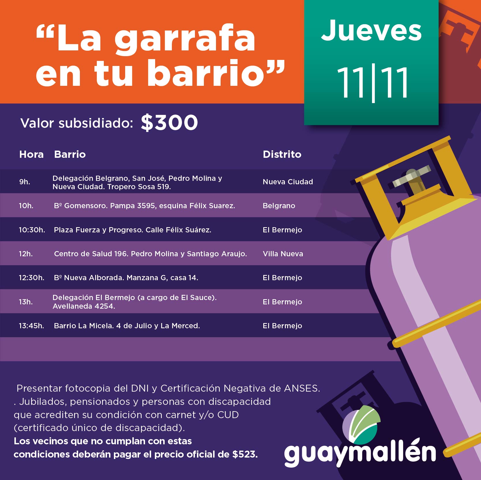 La próxima semana, los vecinos podrán adquirir hasta dos garrafas de 10 kg. a $300 cada una, gracias a un subsidio municipal. Para obtener dicho beneficio, tendrán que presentar fotocopia del DNI y Certificación Negativa de ANSES. Esta iniciativa también incluye a jubilados, pensionados y personas con discapacidad que acrediten su condición con carnet y/o CUD (certificado único de discapacidad).