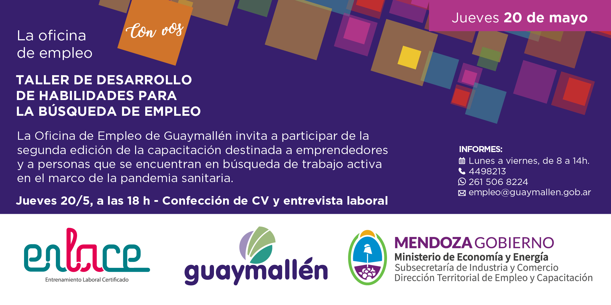 La Oficina de Empleo de Guaymallén invita a los vecinos del departamento a participar de la segunda edición del Taller de desarrollo de habilidades para la búsqueda de empleo. Se trata de un ciclo de charlas online que pretende brindar herramientas a quienes tienen dificultades para conseguir trabajo en el contexto actual.