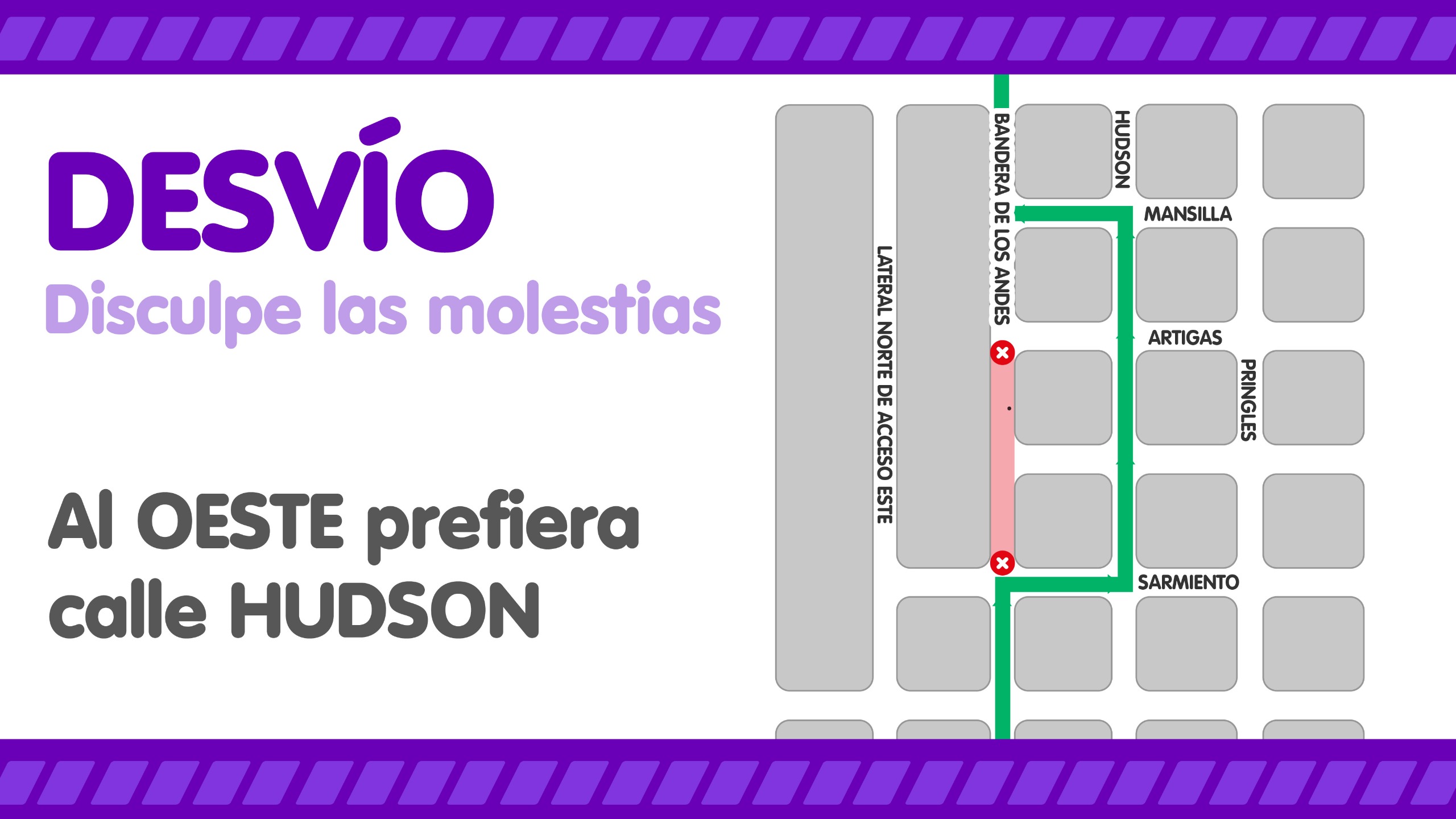En el caso de quienes circulen hacia el oeste, deberán girar hacia el norte por Sarmiento y una cuadra más adelante doblar por Damián Hudson al oeste hasta Mansilla, donde se podrá girar al sur para retomar Bandera de Los Andes.