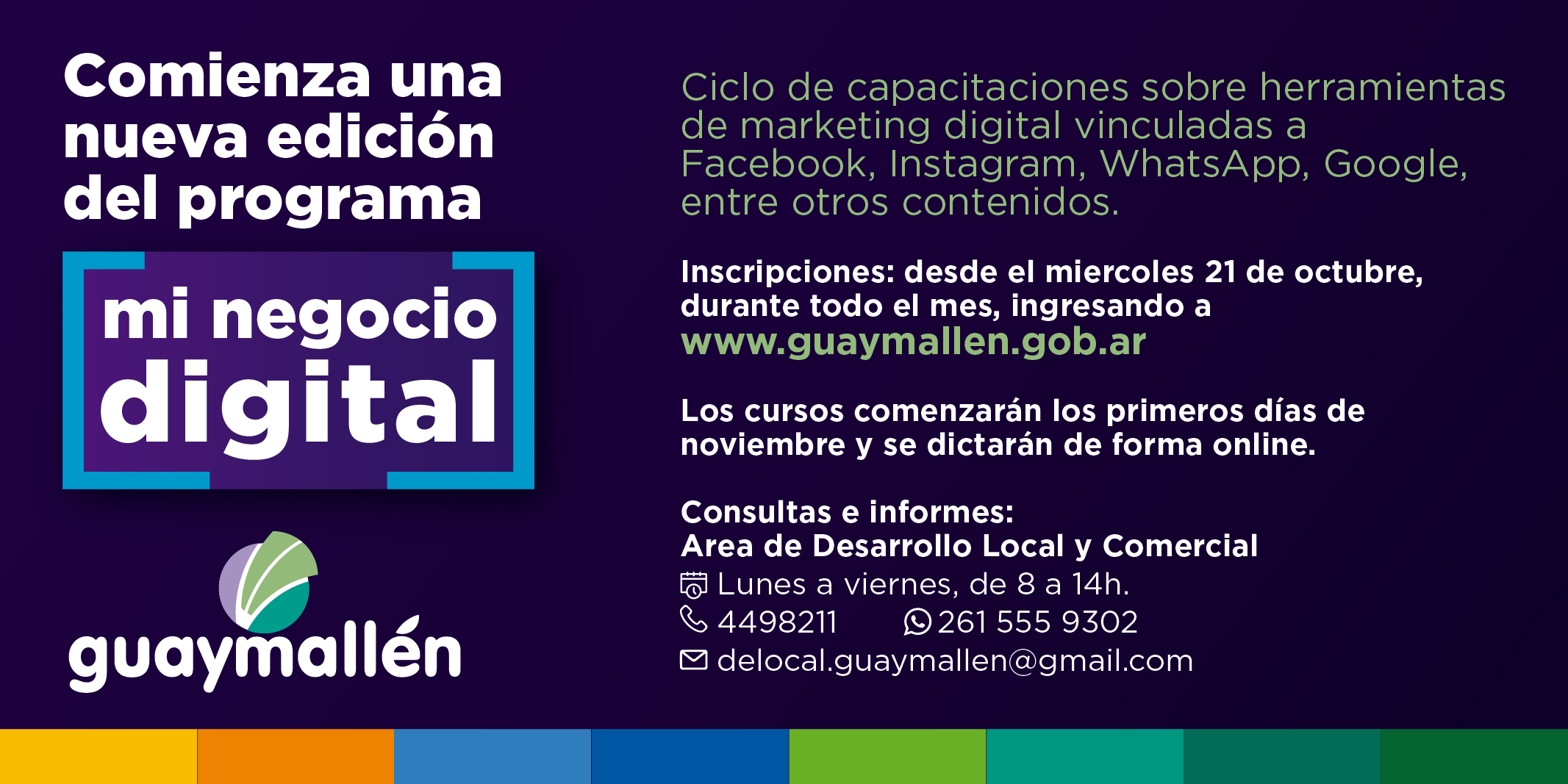 Para consultas y mayor información, pueden comunicarse con el área de Desarrollo Local y Comercial al teléfono 4498211, de lunes a viernes, de 8 a 14 h; vía WhatsApp al 2615559302, de lunes a viernes, de 8 a 14 h; o por mail a delocal.guaymallen@gmail.com
