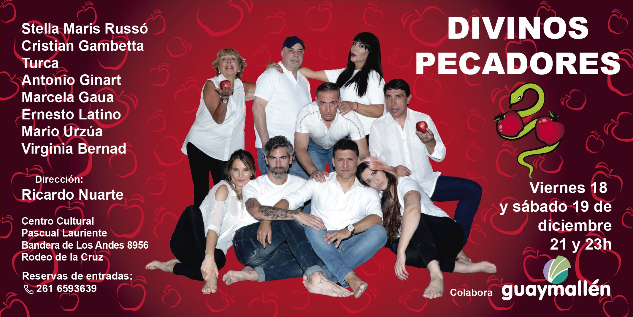 Con el apoyo de la Municipalidad de Guaymallén, los días viernes 18 y sábado 19 de diciembre se podrá disfrutar de la comedia «Divinos pecadores» en el Centro Cultural Pascual Lauriente (Bandera de Los Andes 8956, distrito Rodeo de la Cruz). Se llevarán a cabo dos funciones por día, a las 21 y a las 23 horas, para el público adulto en general. La entrada tiene un valor de $200 y se puede reservar en el 2616593639.