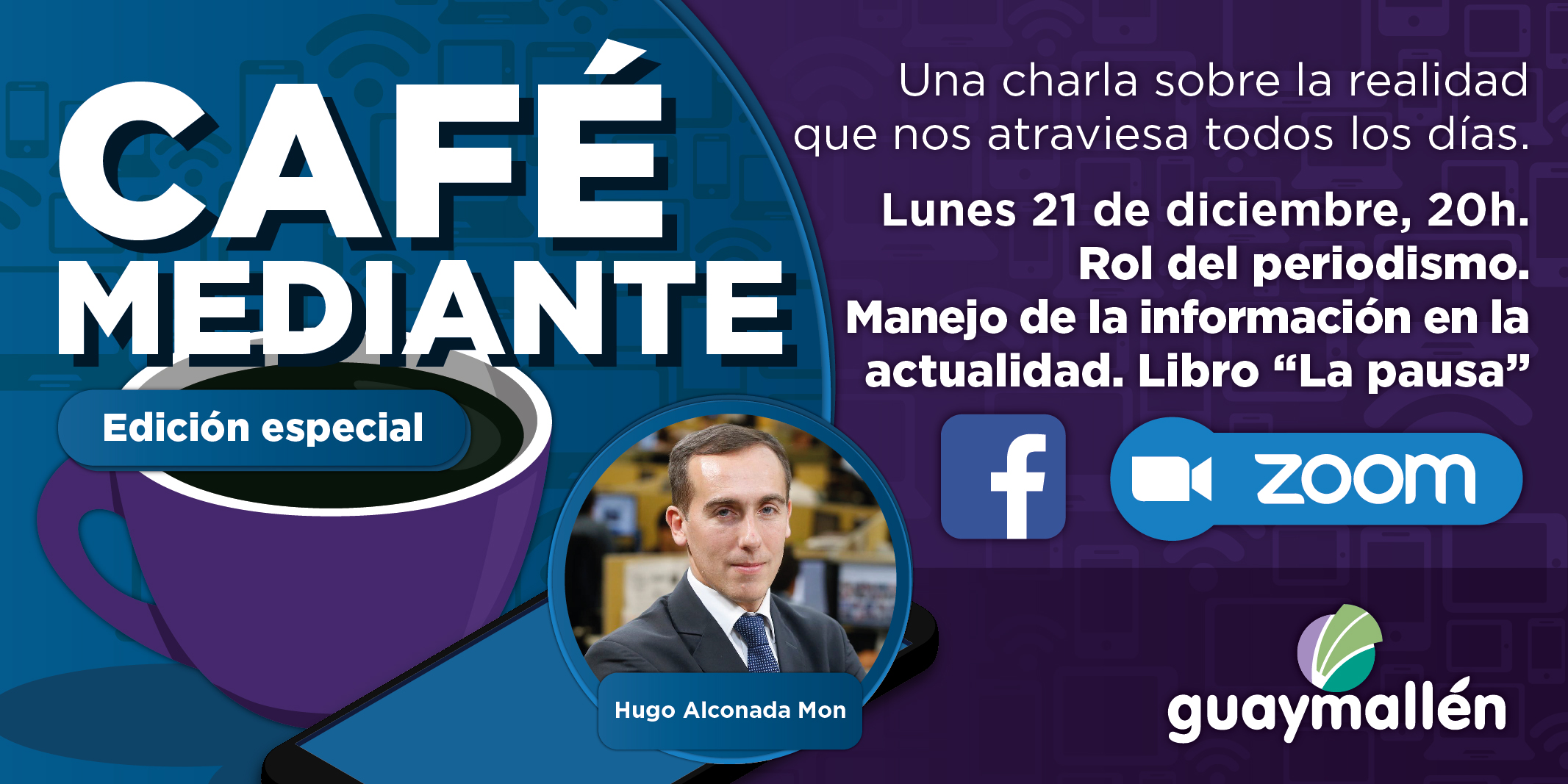 Este lunes 21 de diciembre, el municipio invita a participar del cierre de Café mediante. Por eso, propone una edición especial para abordar temáticas referidas al rol del periodismo, al manejo de la información en la actualidad y al contenido del libro «Pausa» de Hugo Alconada Mon. La transmisión comenzará a las 20h y se realizará a través de la plataforma digital Zoom. Para unirse, los interesados deberán ingresar a https://us02web.zoom.us/j/3150959491 (ID de reunión: 315 095 9491/ Código de acceso: 276971).