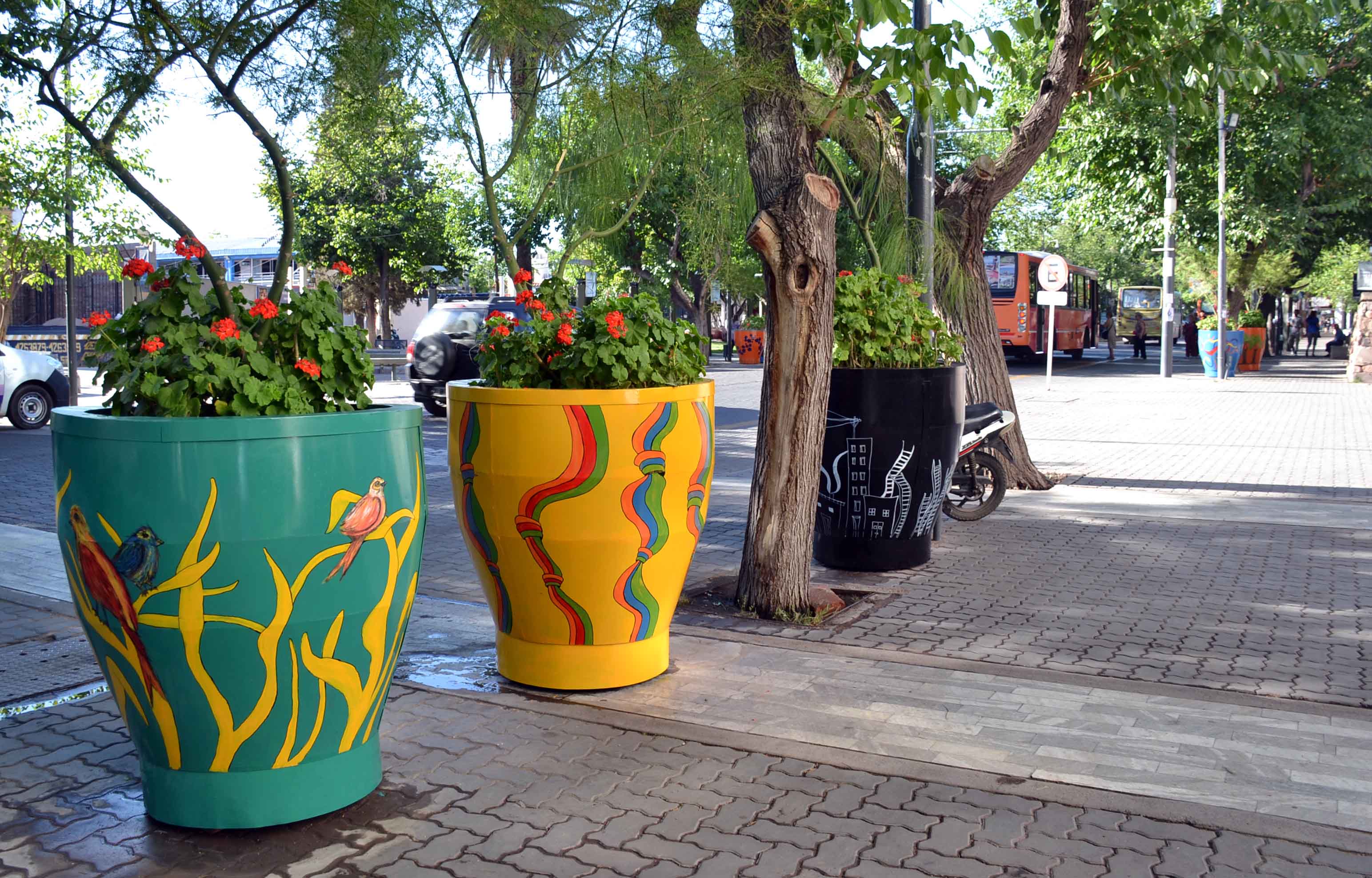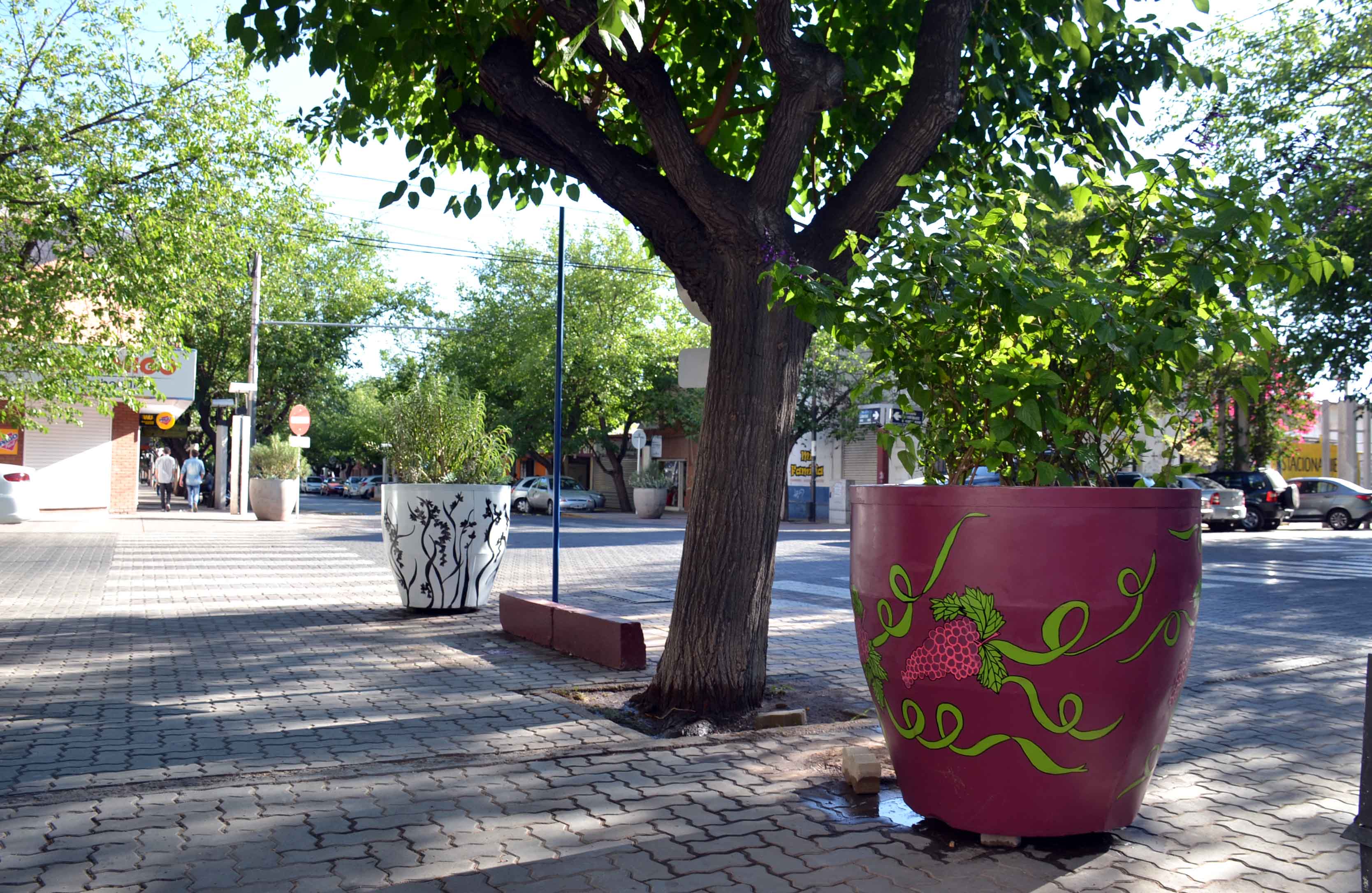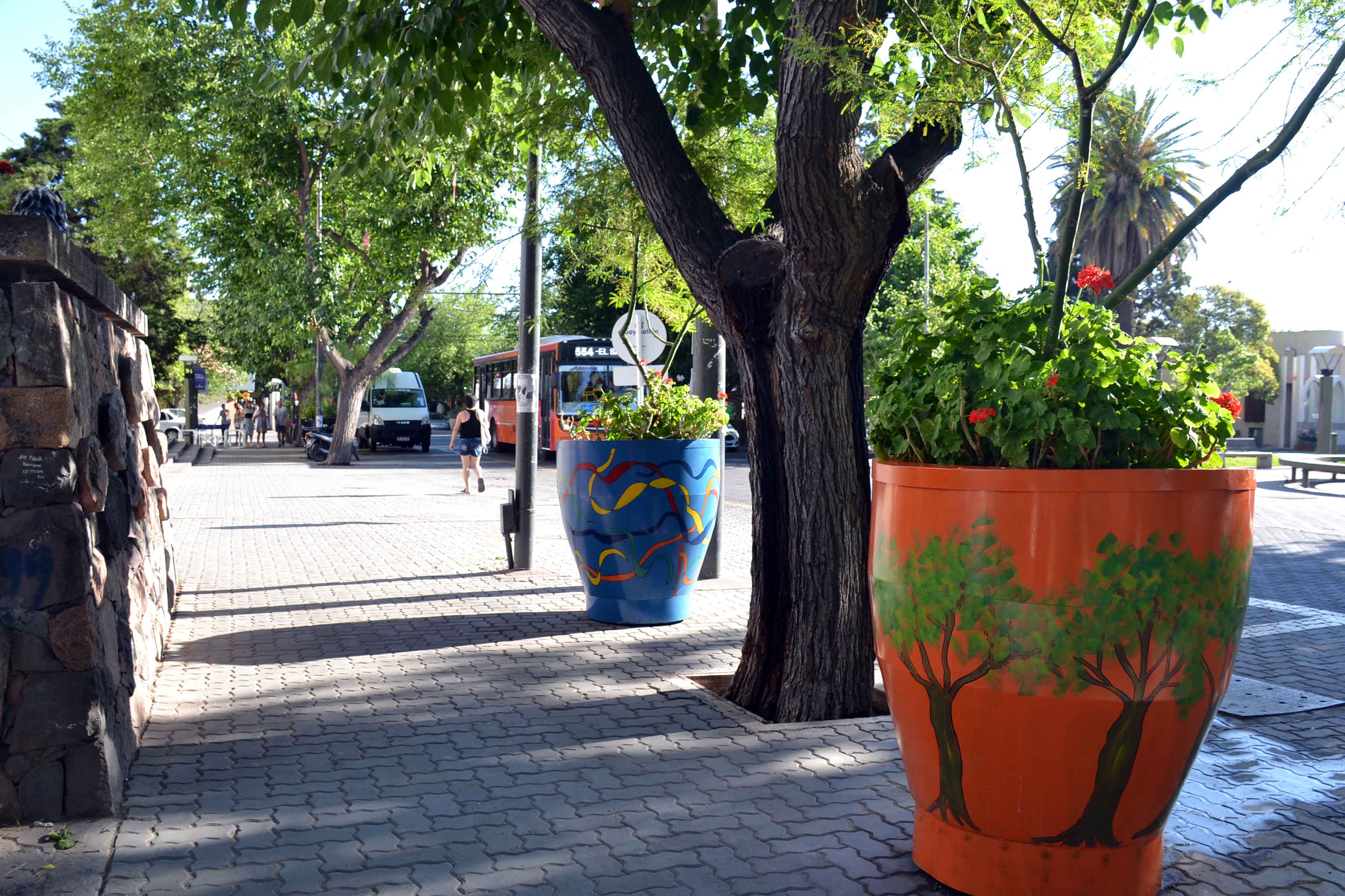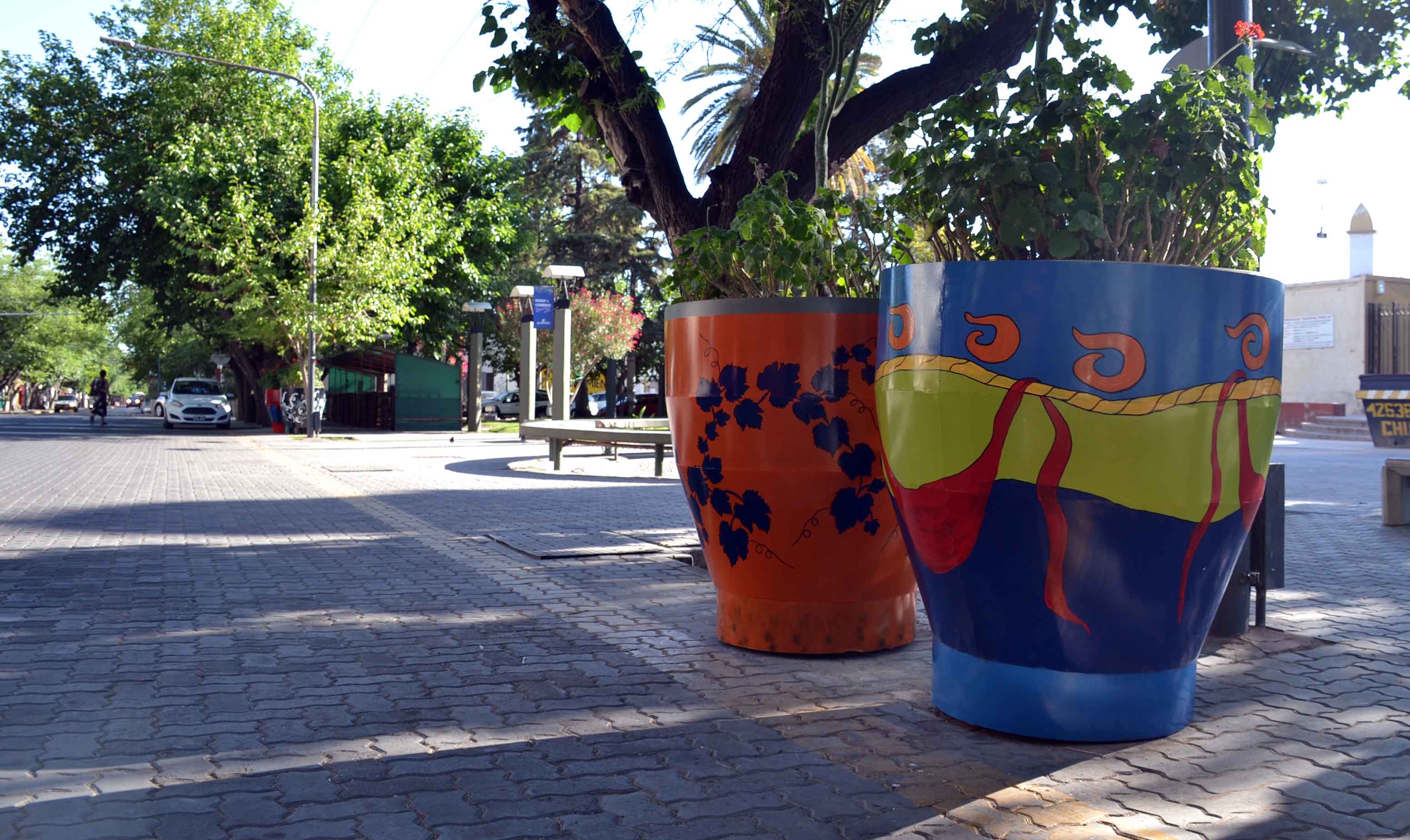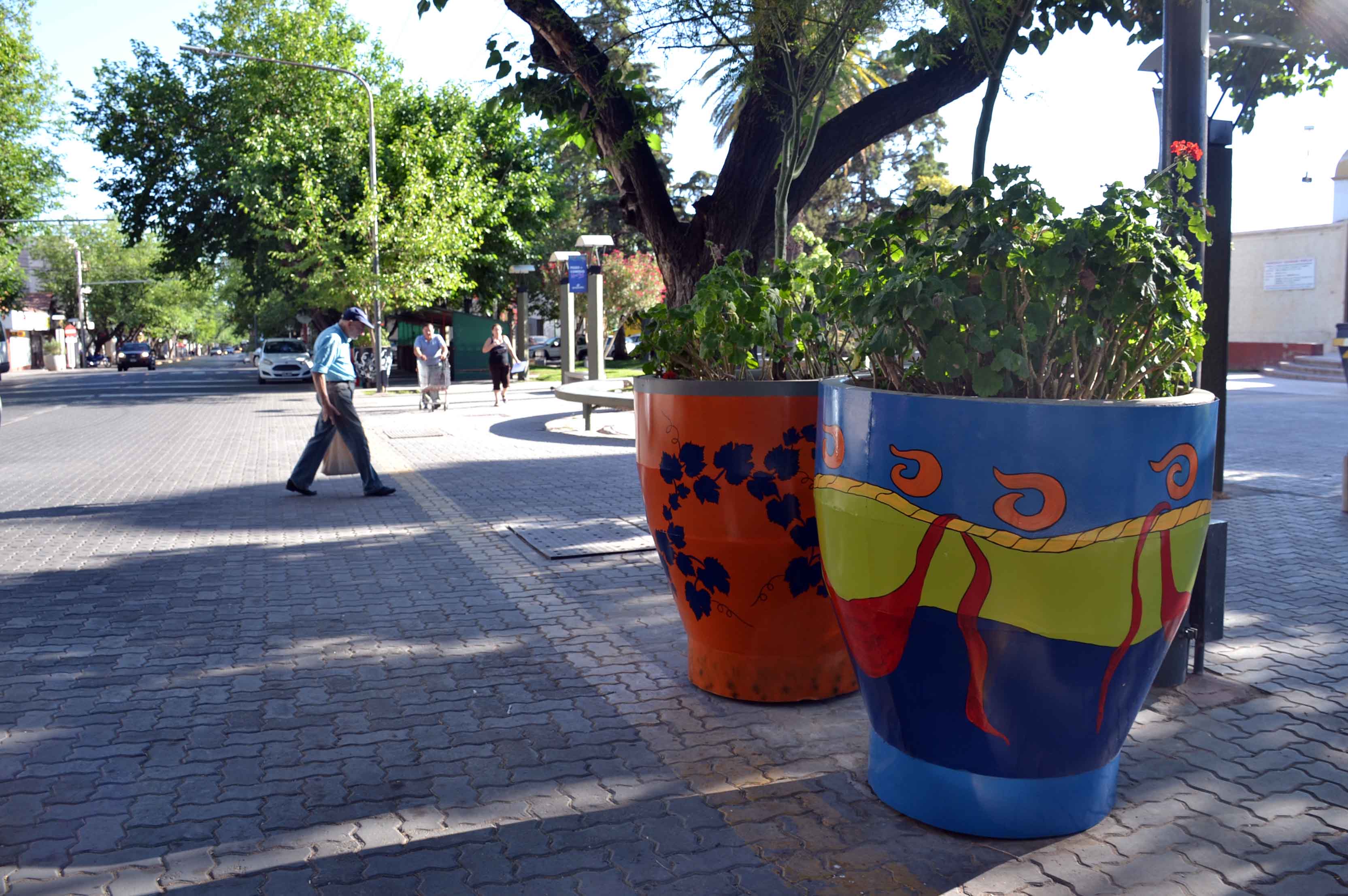 Otros macetones se realzan con líneas danzantes y coloridas, en sintonía con las colectividades, que implican la unión entre naciones y el desarrollo industrial y cultural de Guaymallén.