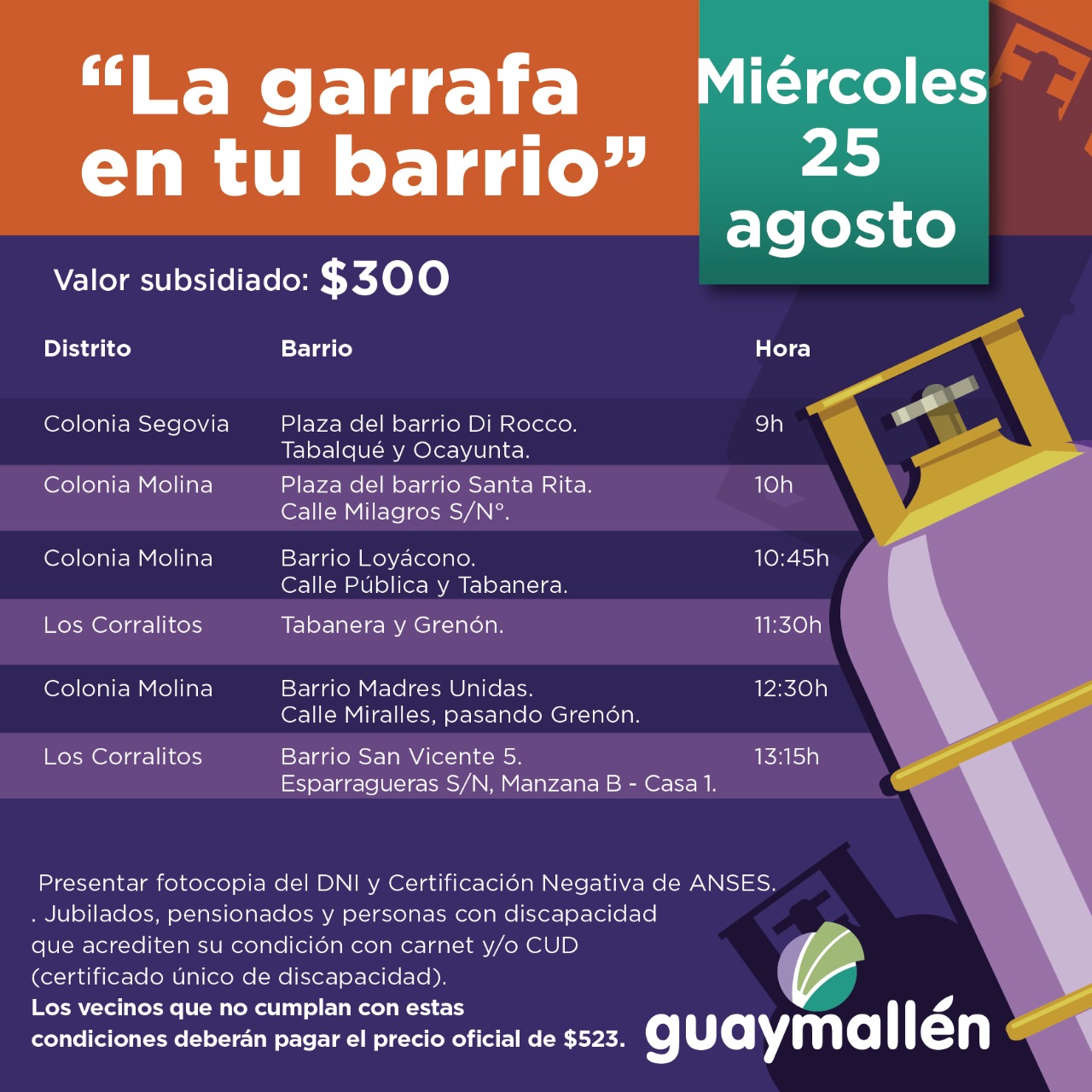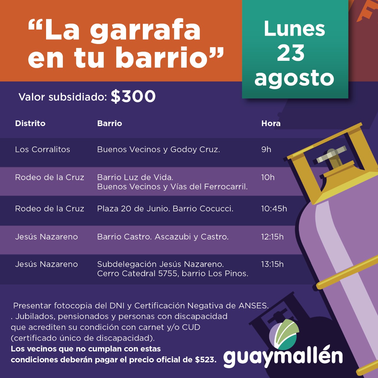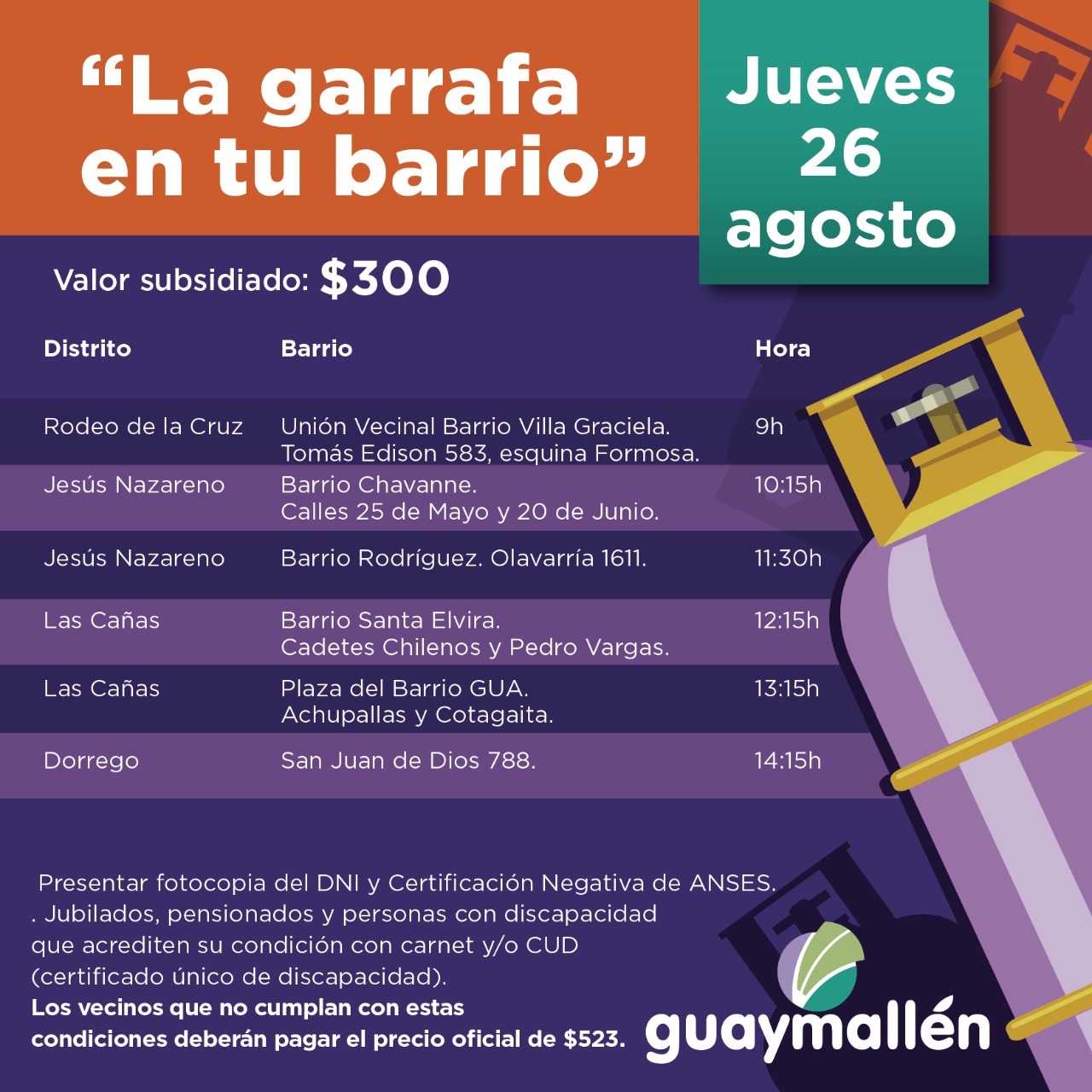 Cronograma de “La garrafa en tu barrio” durante los días 23, 24, 25 y 26 de agosto