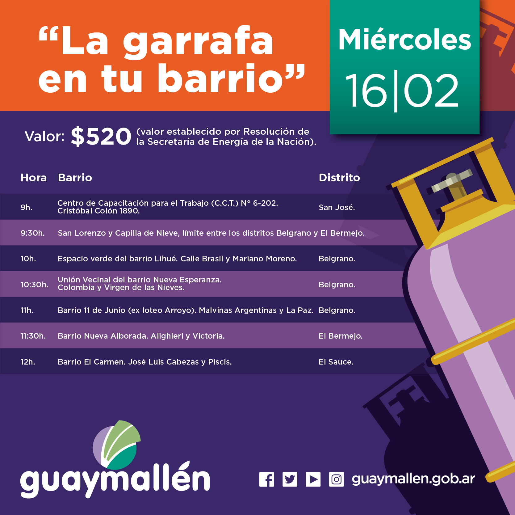 La Municipalidad de Guaymallén informa el circuito de venta directa de gas envasado para la próxima semana, en distintos puntos del departamento. Los interesados podrán comprar garrafas de 10 kg. al precio oficial de $520 (valor establecido por Resolución de la Secretaría de Energía de la Nación).