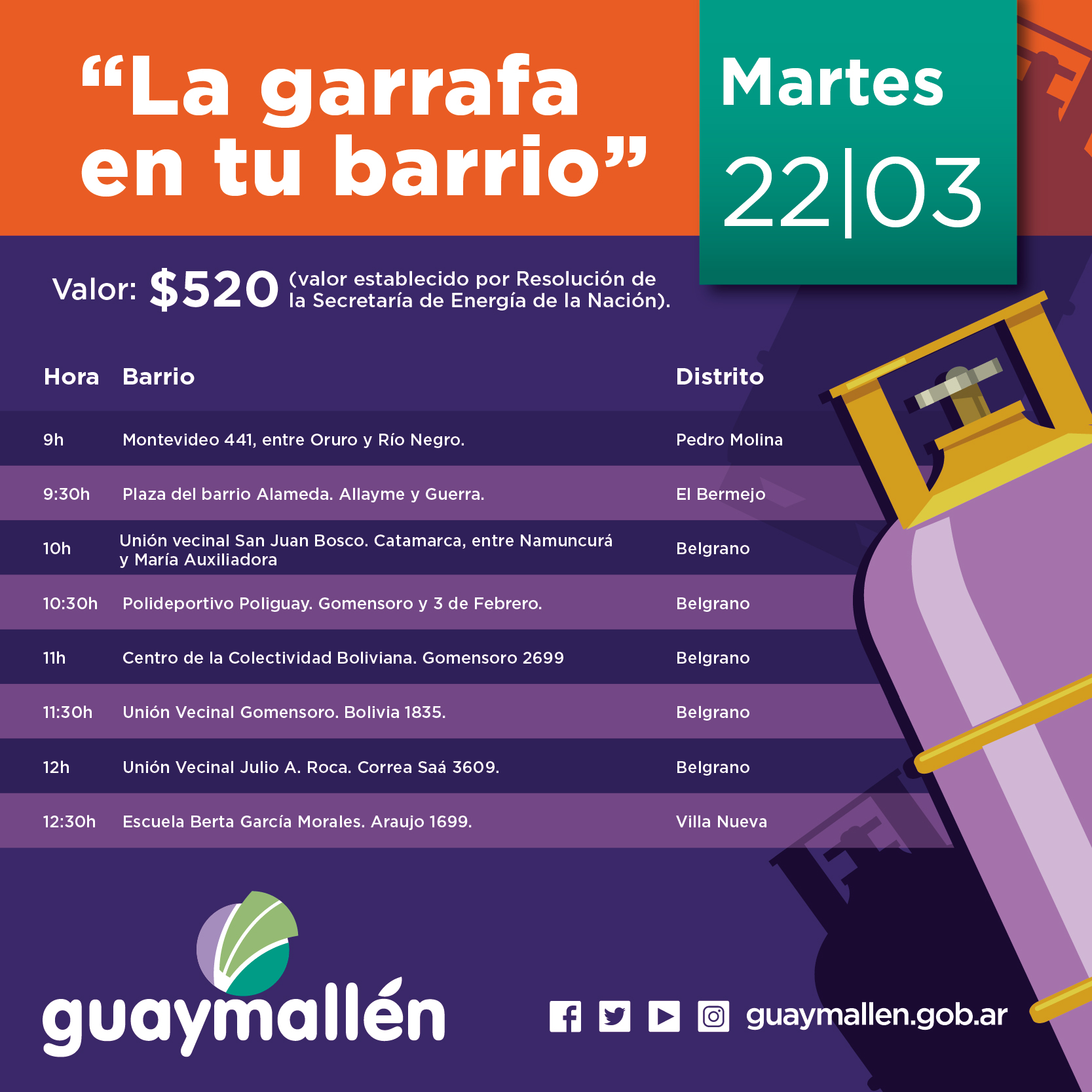 La próxima semana, las familias del departamento podrán realizar la compra directa de gas envasado en diferentes locaciones. Se trata de garrafas de 10 kg. al precio oficial de $520 (valor establecido por Resolución de la Secretaría de Energía de la Nación).