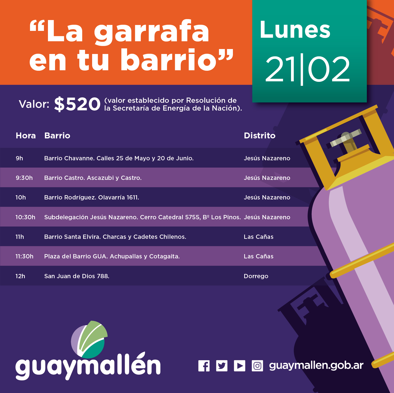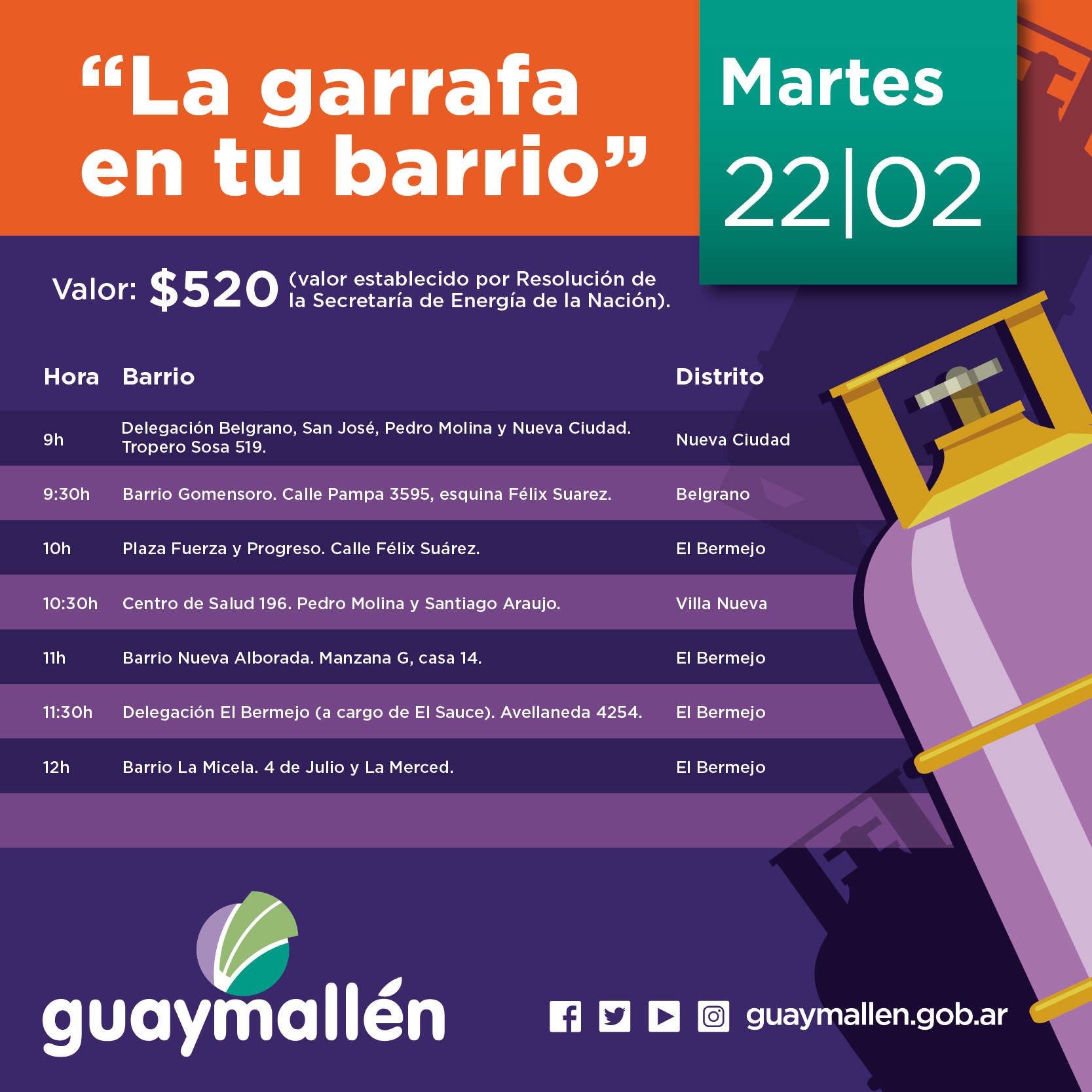 El Municipio local informa el circuito de venta directa de gas envasado durante los días 21, 22, 23 y 24 de febrero, en diversos puntos del departamento. Las familias podrán adquirir garrafas de 10 kg. al precio oficial de $520 (valor establecido por Resolución de la Secretaría de Energía de la Nación).