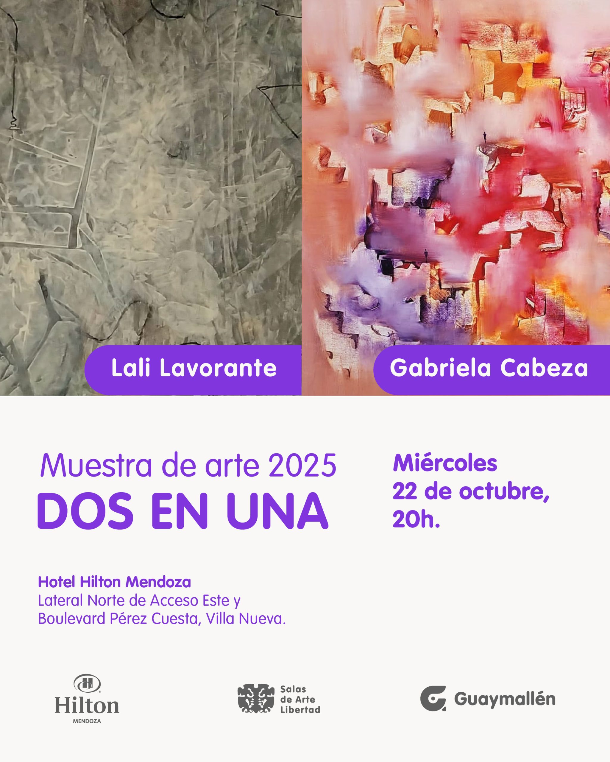 La Municipalidad de Guaymallén invita a participar de la apertura de la muestra “Dos en una”, compuesta por pinturas de las artistas Gabriela Cabeza y Lali Lavorante. La inauguración será el miércoles 22 de octubre, a partir de las 20h, en el espacio de arte del Hotel Hilton Mendoza.