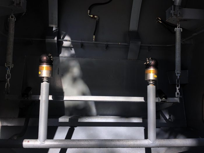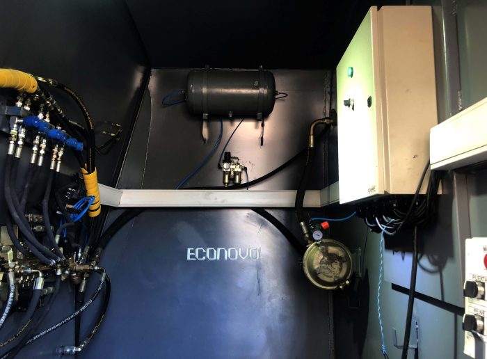 Además, consta de un elevador tipo polivalente, con enganche peine frontal; cilindros hidráulicos gemelos; estribo para cargadores; una bomba de vacío de tolva para aguas sucias, que se acciona automáticamente y trabaja a 200 litros/minuto; sala de máquinas integrada, con escalera de acceso lateral, donde se encuentra el sistema hidráulico incorporado, electrónico y cajonera de mantenimiento; compuerta hidráulica de apertura total, útil para la limpieza de derrames de contenedores ya desinfectados; y sistema electrónico de comando programado fijo y con control remoto para limpieza y mantenimiento, localizado en la parte trasera de la unidad.