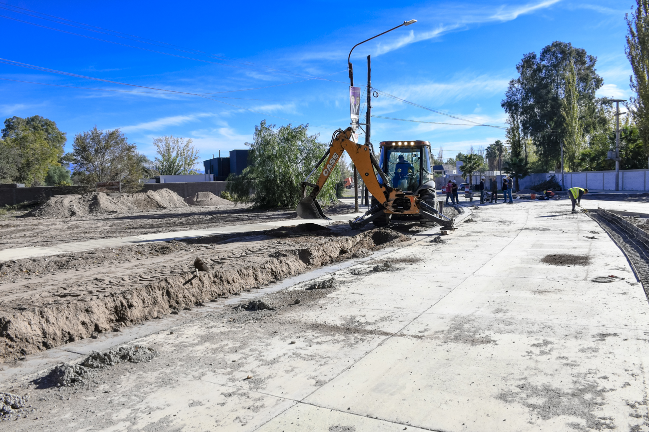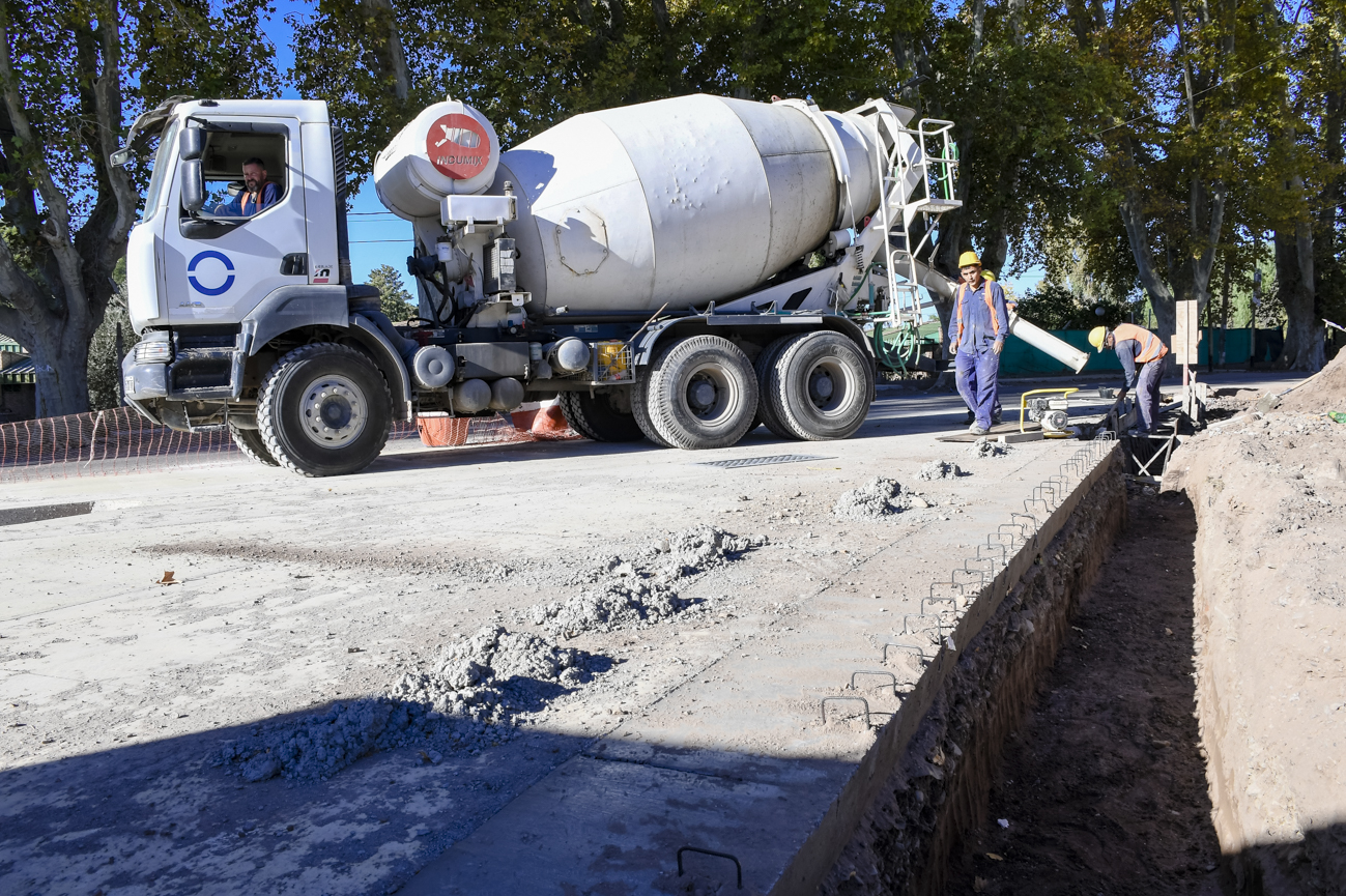 En marco del proyecto integral Avellaneda V, la Municipalidad de Guaymallén avanza sin pausa en la instalación de losas de hormigón en el nodo Oeste de la intersección de Mathus Hoyos y Aristóbulo del Valle, en el Distrito de El Bermejo.
