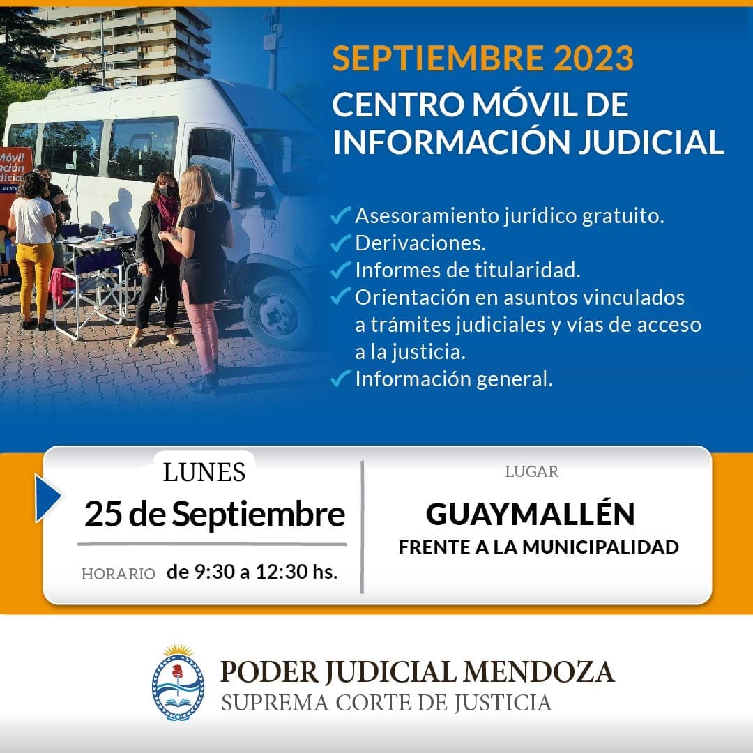 El lunes 25 de septiembre, de 9:30 a 12:30h, el Centro Móvil de Información Judicial atenderá al público frente a la explanada municipal (Libertad 720, distrito Villa Nueva).