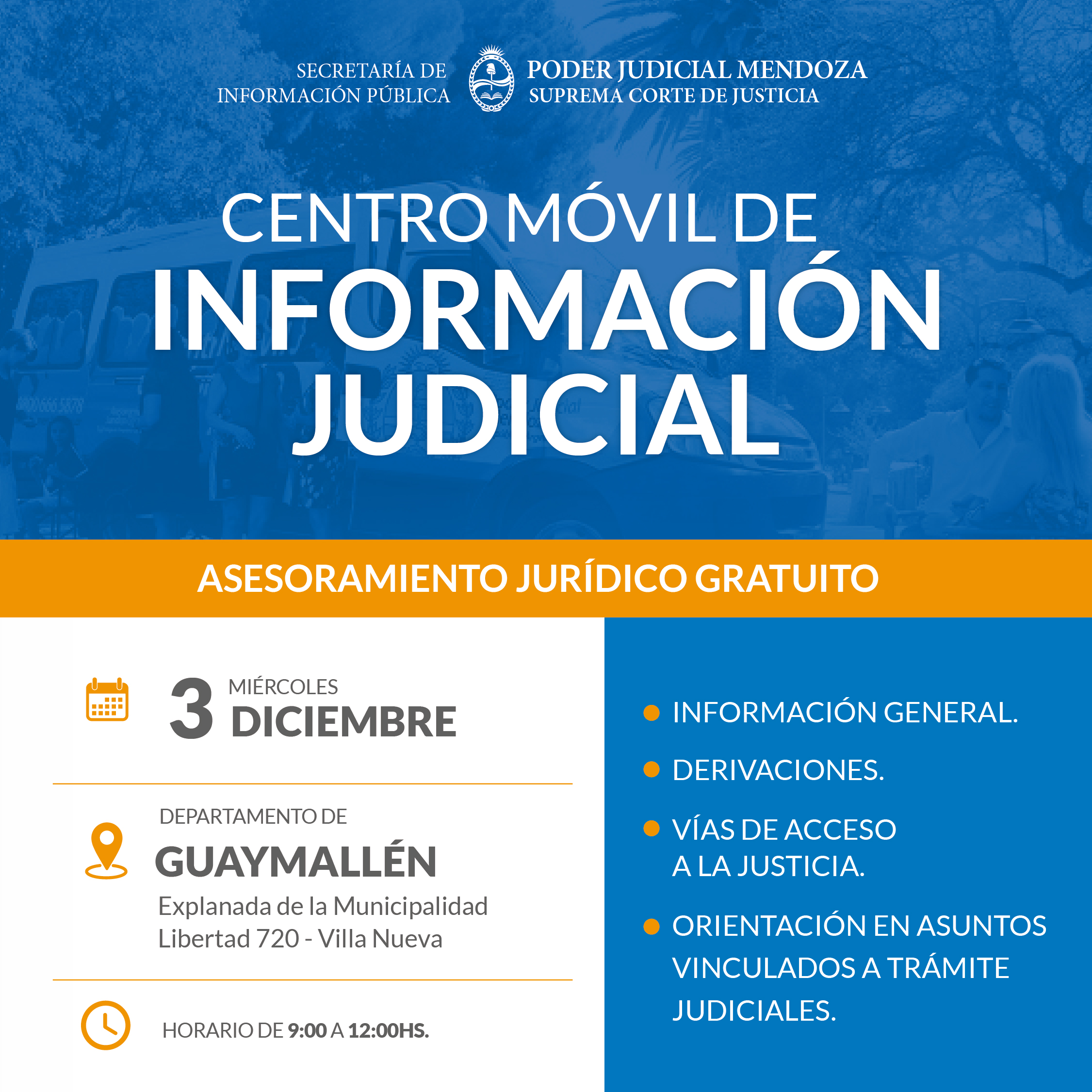 Este miércoles 3 de diciembre, el Centro Móvil de Información Judicial (CMIJ) visitará el departamento de Guaymallén, donde se instalará en la explanada de la Municipalidad, ubicada en Libertad 720. La iniciativa busca acercar servicios esenciales a la comunidad y facilitar el acceso a la justicia para todas las personas que necesiten orientación legal.
