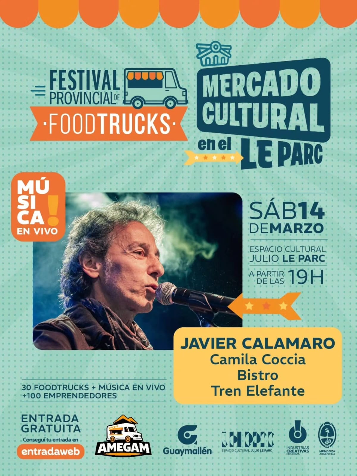 La Subsecretaría de Cultura de Mendoza, a través de la Dirección de Industrias Creativas y en conjunto con la Municipalidad de Guaymallén y AMEGAN (Asociación Mendocina de Gastronomía Móvil), presenta una nueva edición del Mercado Cultural. La cita, enmarcada en el 90° aniversario de la Fiesta Nacional de la Vendimia, se desarrollará del viernes 13 al domingo 15 de marzo, desde las 19h, en el Espacio Cultural Julio Le Parc (Mitre y Godoy Cruz, de Guaymallén).