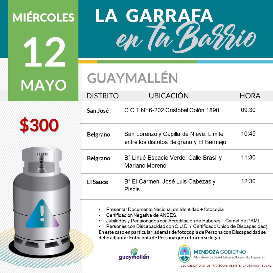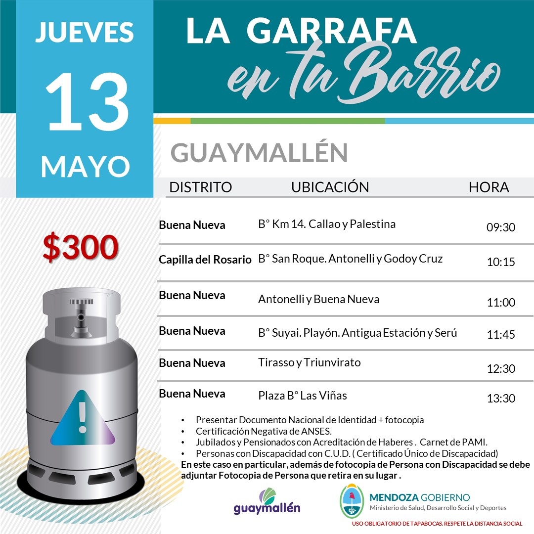 La Municipalidad de Guaymallén informa el cronograma actualizado de venta de garrafas de 10 Kg. a precio subsidiado.