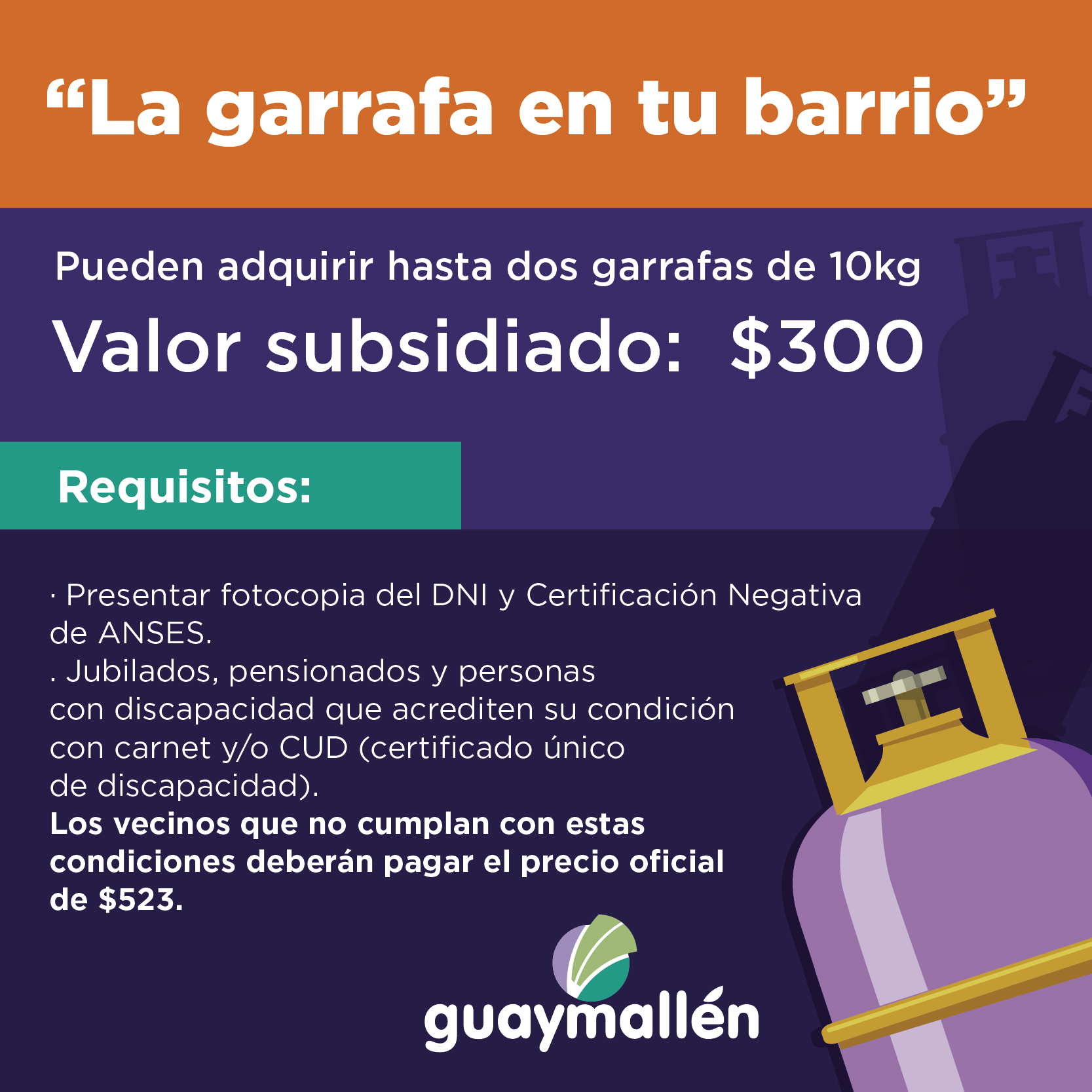 La próxima semana, muchas familias podrán adquirir hasta dos garrafas de 10kg a $300, a partir de un subsidio municipal. Para acceder a dicho beneficio, deberán presentar fotocopia del DNI y Certificación Negativa de ANSES. Esta propuesta también incluye a jubilados, pensionados y personas con discapacidad que acrediten su condición con carnet y/o CUD (certificado único de discapacidad).