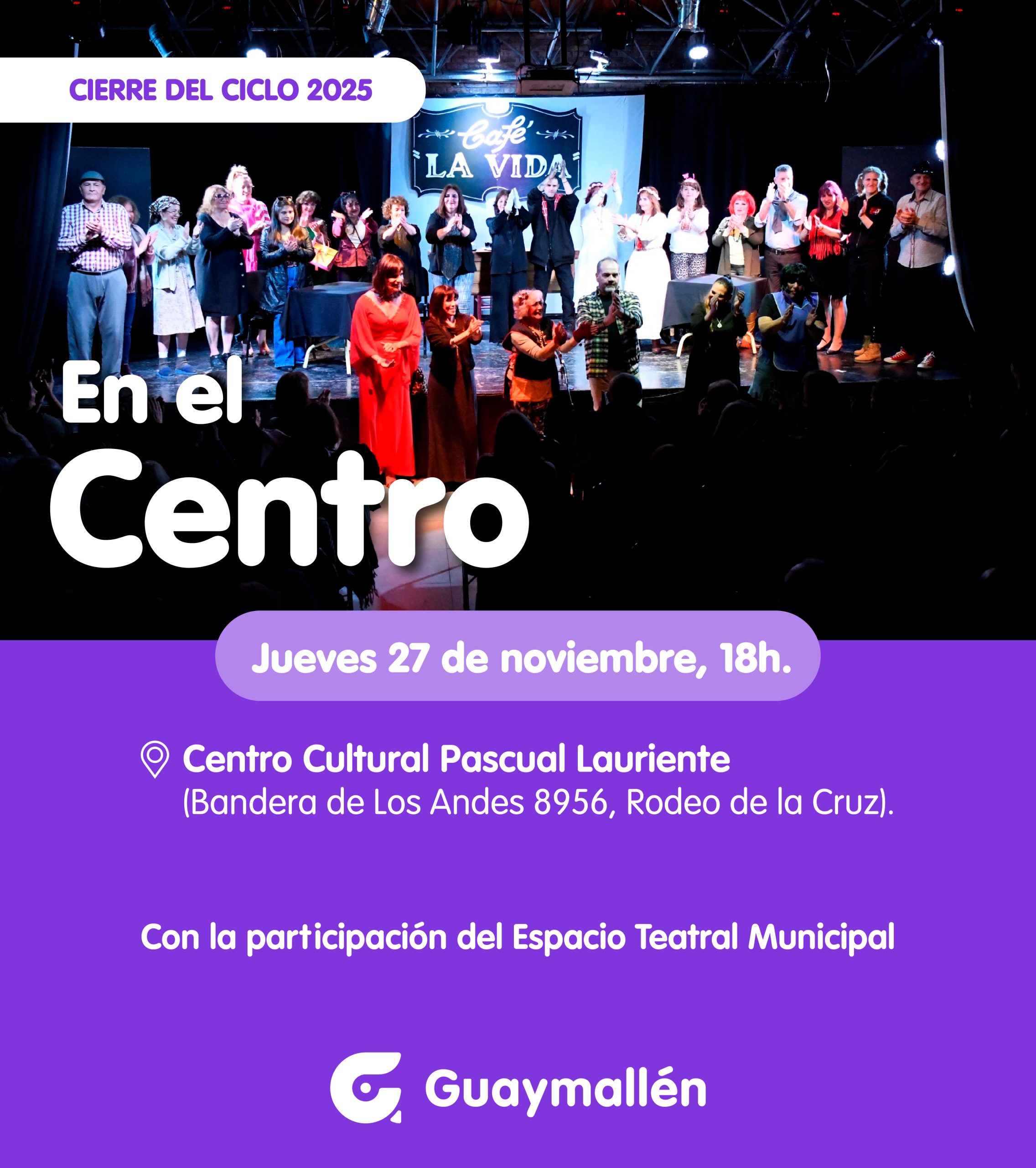 La Municipalidad de Guaymallén invita al cierre anual del programa “En el Centro”, que se realizará el próximo miércoles 27 de noviembre, a las 18h, en el Centro Cultural Pascual Lauriente (Bandera de Los Andes 8956, Rodeo de la Cruz), con entrada gratuita y cupos limitados, hasta completar la capacidad de la sala.