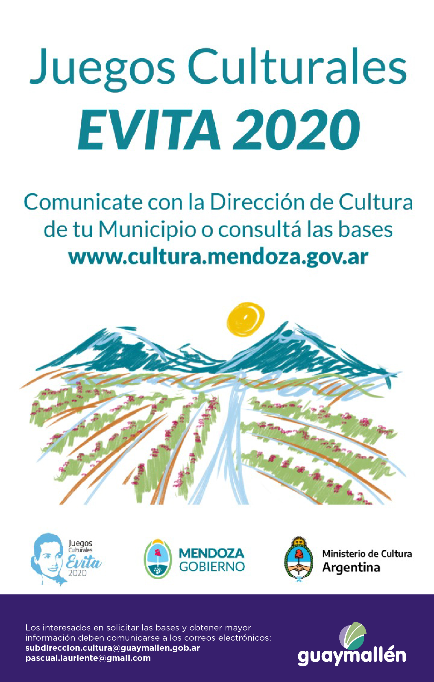 La comuna recuerda que continúan disponibles las inscripciones para la instancia municipal de los Juegos Culturales Mendocinos Evita 2020. Coordinada junto al Ministerio de Cultura y Turismo de la Provincia, este año la iniciativa se realizará de forma virtual bajo el lema “Abraza tu Cultura”.