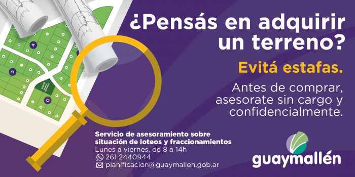 Finalmente, es importante recordar que el municipio SIEMPRE PUEDE ASESORARLO SIN CARGO Y CONFIDENCIALMENTE. Para ello, pueden comunicarse, vía WhatsApp, al teléfono 2612440944, o vía mail a planificacion@guaymallen.gob.ar.