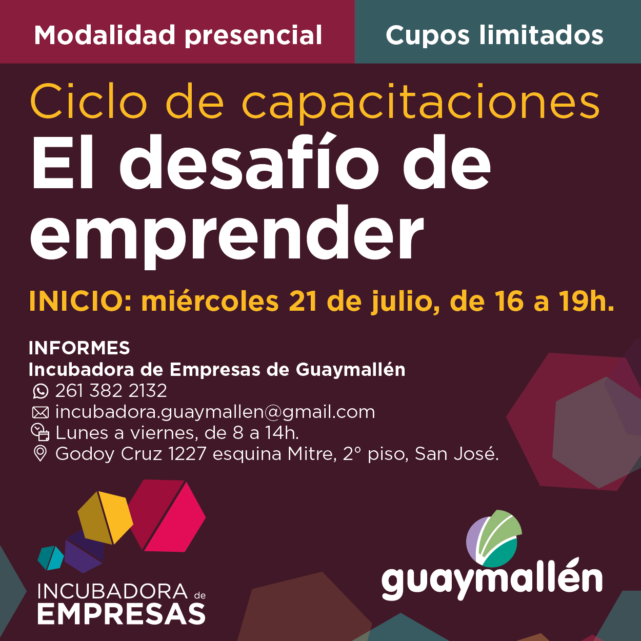 Para acceder, los interesados deben inscribirse completando el formulario web que se encuentra en el siguiente link: https://bit.ly/2UXnR9P. Para más información, pueden contactarse con la Dirección de Desarrollo Económico, al teléfono 261 3822132, de lunes a viernes, de 8 a 14h; o por mail a: incubadora.guaymallen@gmail.com.