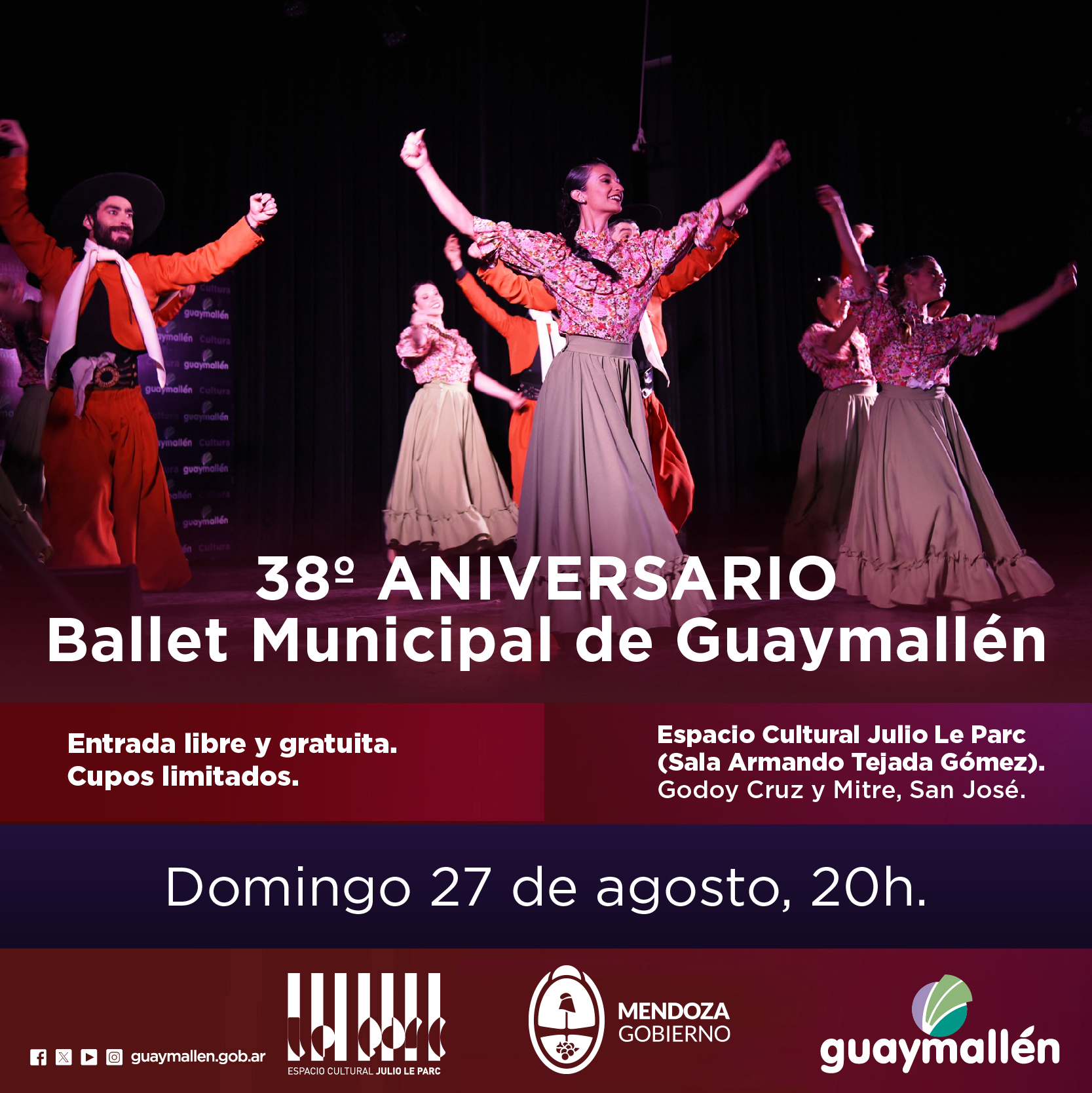 El elenco estable que conforma el Ballet Municipal de danzas de Guaymallén cumple 38 años desde su creación y lo celebrará con un espectáculo artístico, el próximo domingo 27 de agosto, a las 20h, en la Sala Armando Tejada Gómez del Espacio Cultural Julio Le Parc (Mitre y Godoy Cruz, de San José).