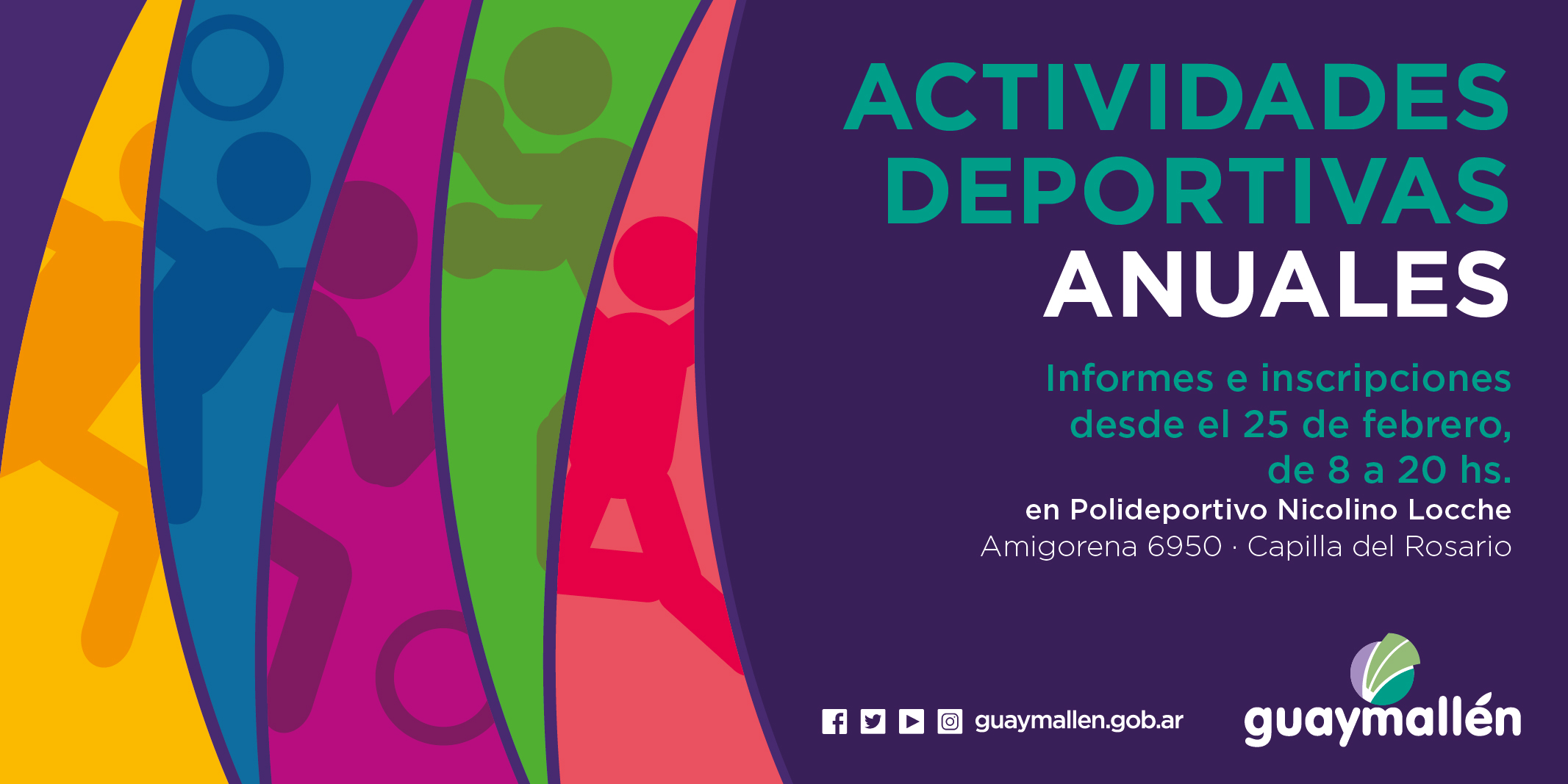 Desde el lunes 25 de febrero estarán abiertas las inscripciones correspondientes a las actividades deportivas anuales que propone la Dirección de Deportes de la comuna. Para informes e inscripciones, los interesados deberán concurrir, a partir de ese día, al Polideportivo Nicolino Locche (Amigorena 6950, Capilla del Rosario), de lunes a viernes, de 8 a 20.