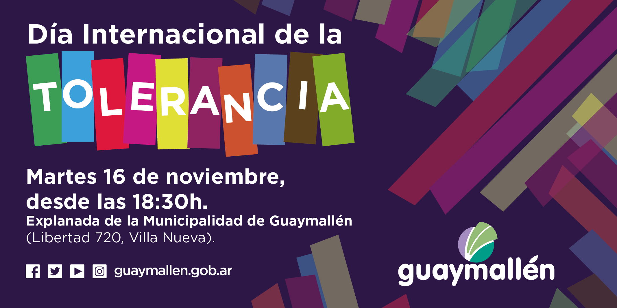 El próximo martes 16 de noviembre, en el Día Internacional de la Tolerancia, la comuna invita a compartir un encuentro con base en la riqueza que proporciona la diversidad de religiones, culturas, lenguas y etnias. Será a partir de las 18:30h, en la explanada del edificio municipal (Libertad 720, Villa Nueva).