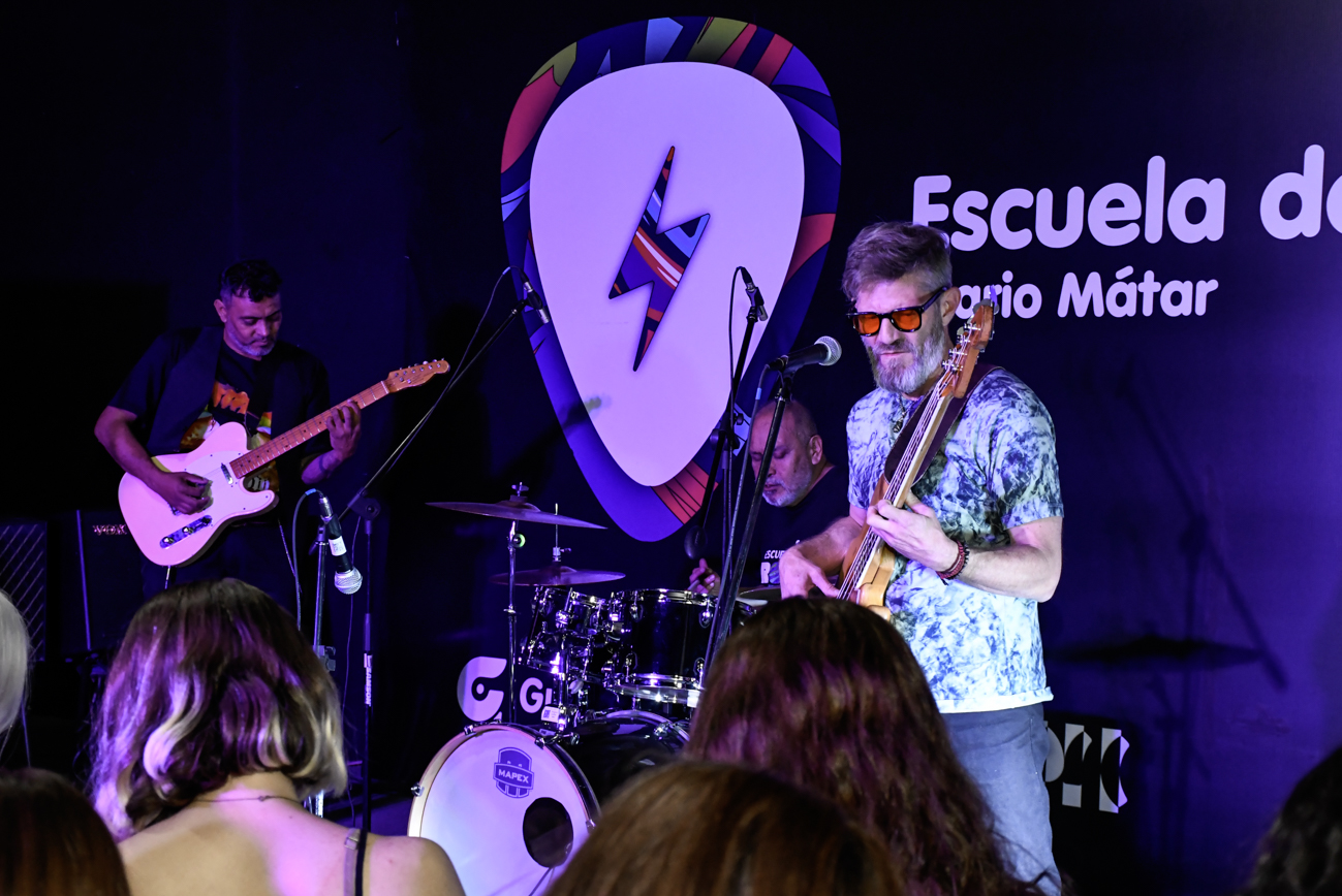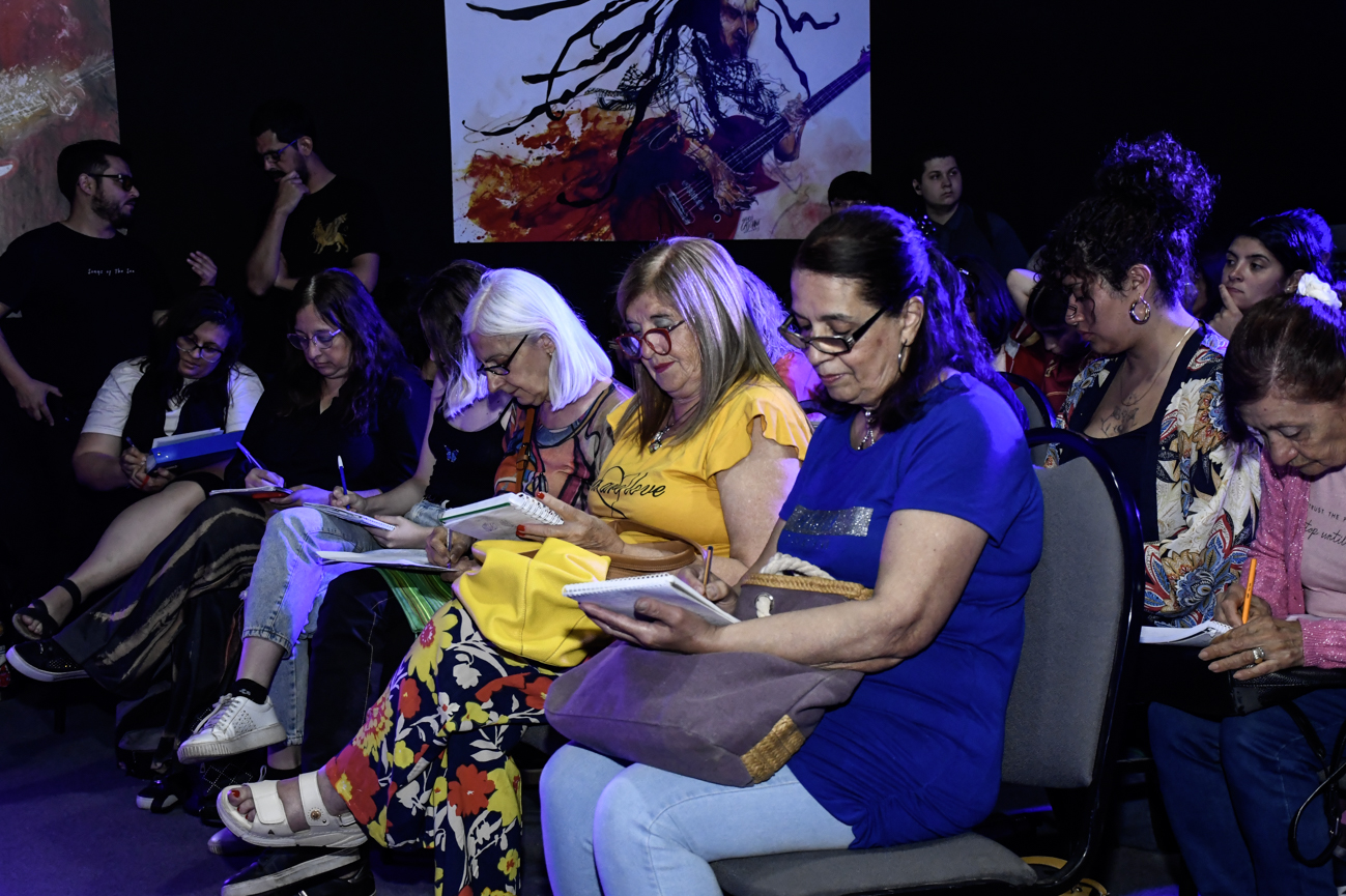 Los músicos David “Zurdo” Paz (baterista), Federico Zuin (bajista) y Juanci Moreno (bajista y guitarrista) se unieron a los profesores Frank Morán y Nicolás Garro en la sede de la Escuela de Rock Mario Mátar para brindar un encuentro con diferentes consignas de escritura y lectura en vivo y un cierre especial con la lectura de un poema colectivo.