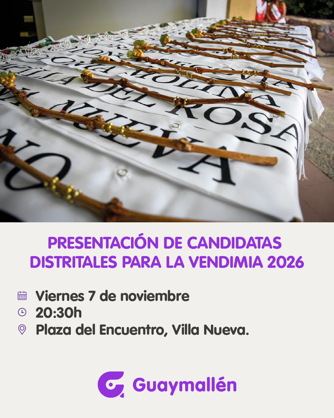 La Municipalidad de Guaymallén invita a vecinos y visitantes a participar del acto de presentación y traspaso de atributos de las representantes distritales para la Vendimia 2026. La cita será el viernes 7 de noviembre, a las 20:30h, en la Plaza del Encuentro (Libertad, entre España e Italia, Villa Nueva).