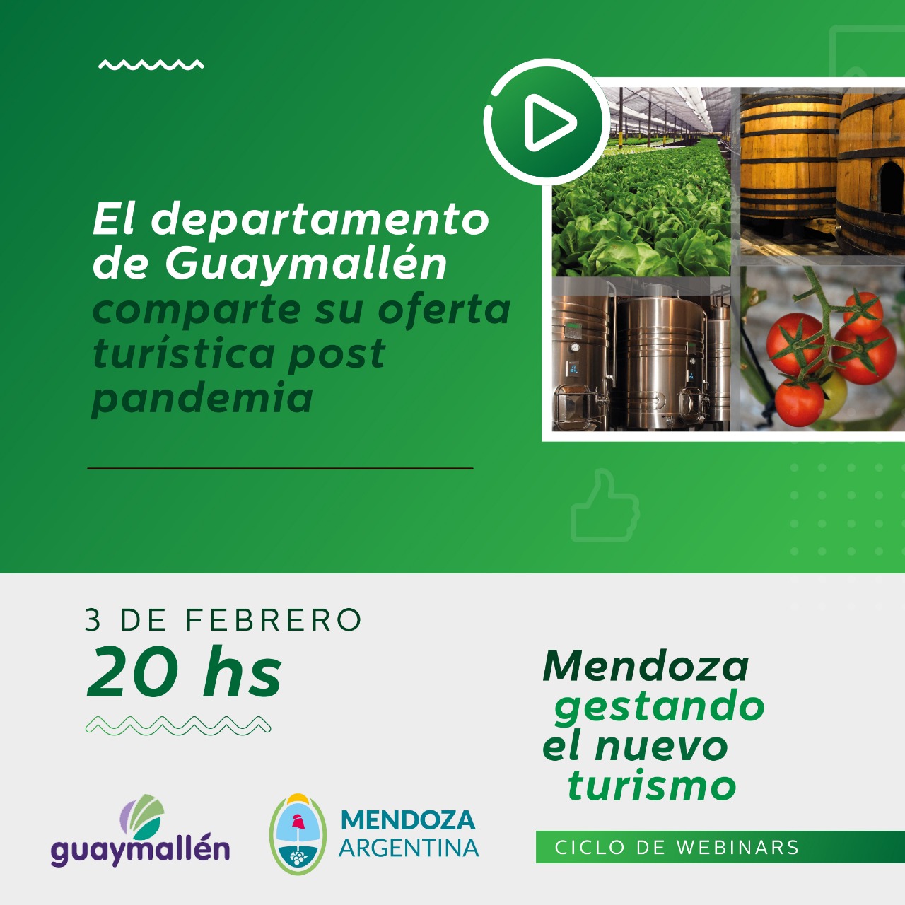 Este miércoles 3 de febrero, la Capital del Espumante participará de la edición 2021 del ciclo de webinarios «Mendoza gestando el nuevo turismo». Se trata de una serie de charlas virtuales, que son abiertas a todo público y gratuitas, organizadas por el Ministerio de Cultura y Turismo de Mendoza para promover las actividades del rubro y la oferta turística pospandemia de cada municipio.
