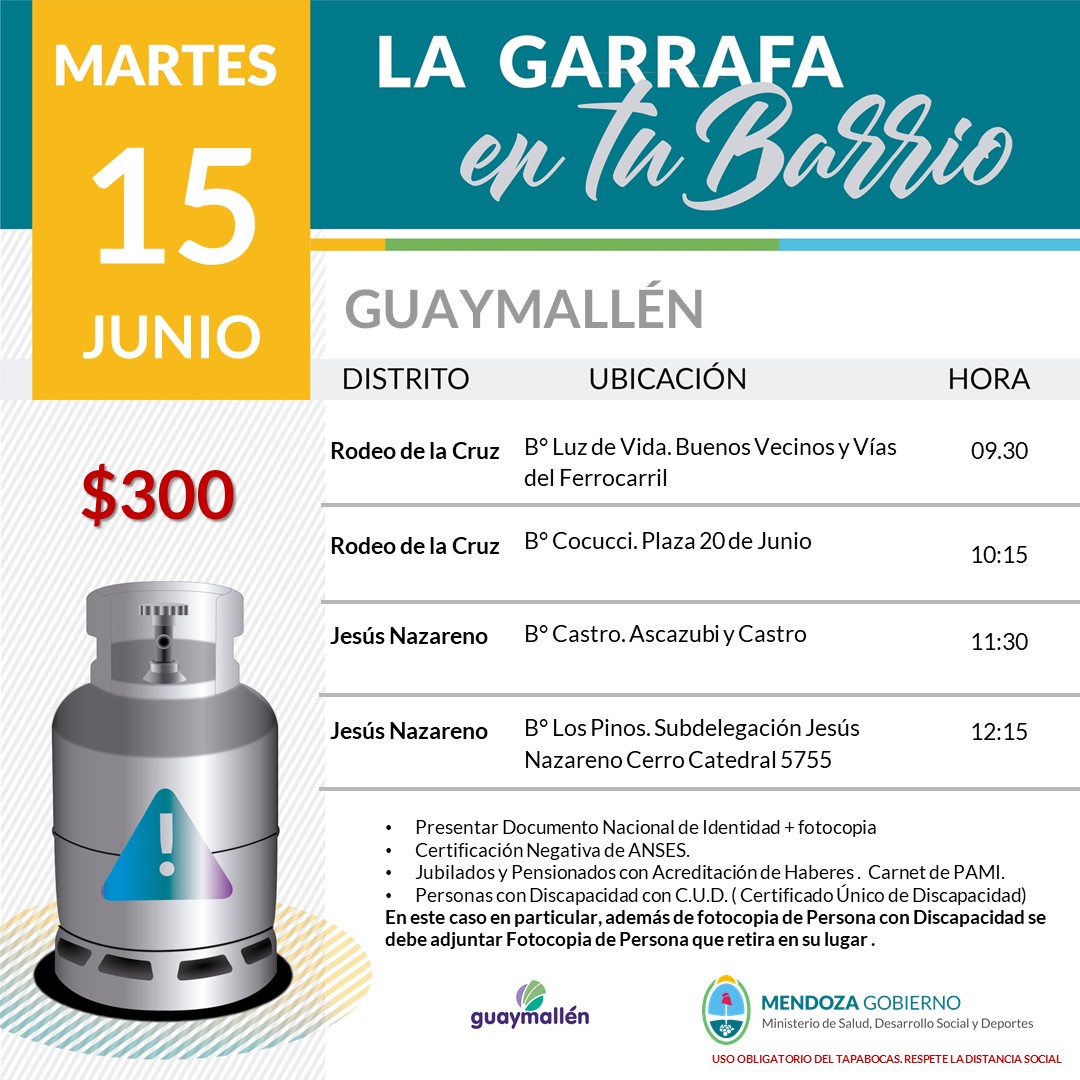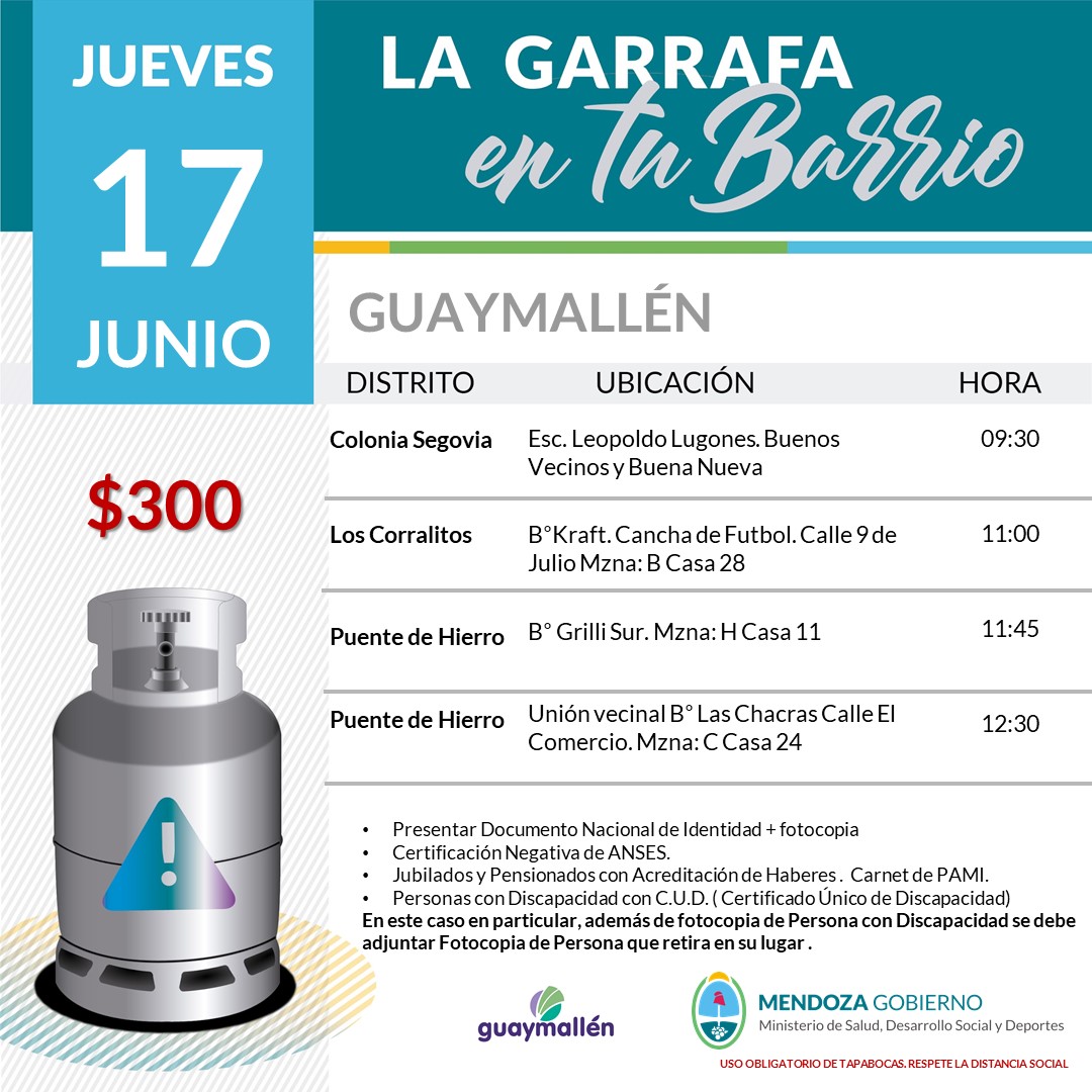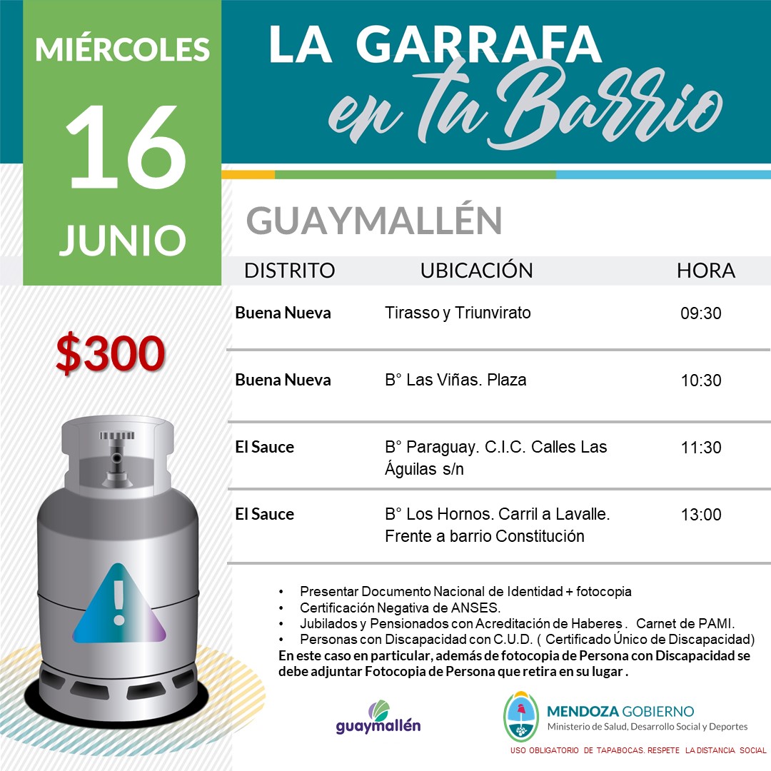 Los días martes 15, miércoles 16 y jueves 17 de junio, los vecinos podrán adquirir hasta dos garrafas a $300, gracias al operativo subsidiado con fondos provinciales, que se extenderá durante todo el periodo invernal. Para acceder a dicho beneficio deben presentar fotocopia del DNI y Certificación Negativa de ANSES. Esta propuesta también incluye a jubilados, pensionados y personas con discapacidad que acrediten su condición con carnet y/o CUD (certificado único de discapacidad).