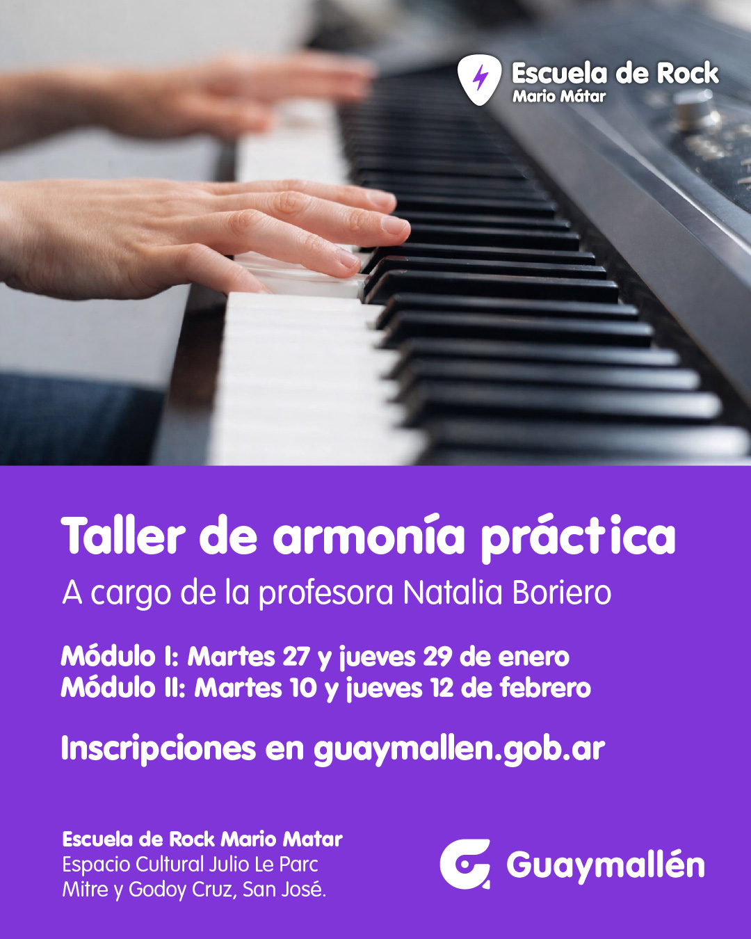 En esta ocasión se dictará un Taller de armonía práctica. El curso es gratuito, estará a cargo de la profesora Natalia Boriero y se realizará en el auditorio Goy Ogalde de la Escuela de Rock Mario Matar, ubicada en la explanada del Espacio Cultural Julio Le Parc (Mitre esquina Godoy Cruz, San José).