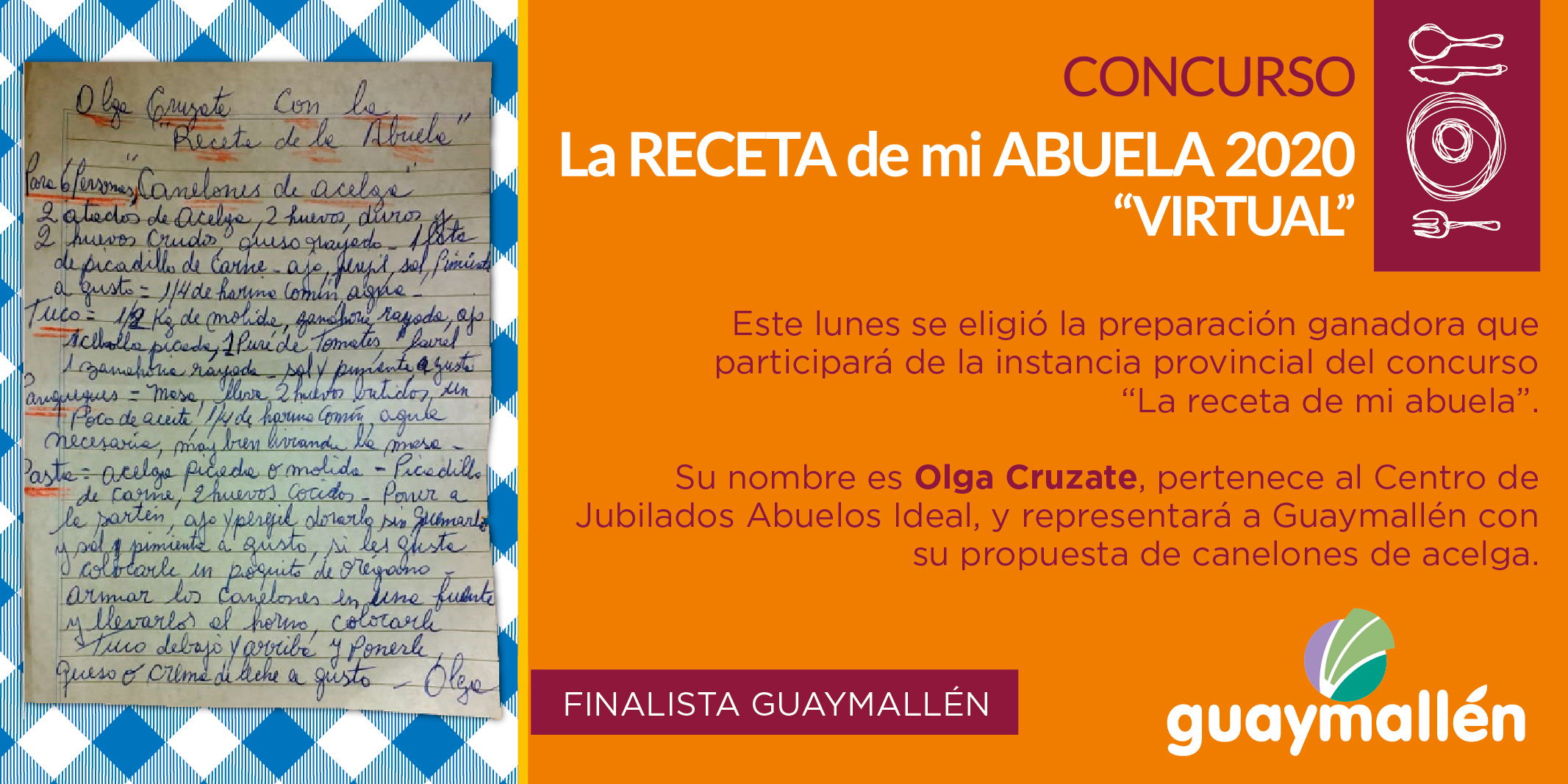 Tras una preselección de 17 participantes, este lunes se eligió la preparación ganadora que participará de la instancia provincial del concurso “La receta de mi abuela”. Su nombre es Olga Cruzate, pertenece al Centro de Jubilados Abuelos Ideal, y representará a Guaymallén con su propuesta de canelones de acelga.