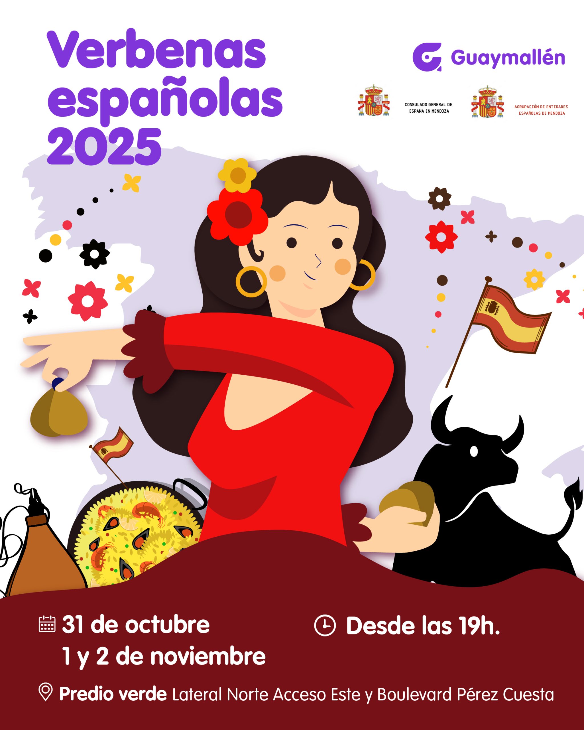 Llega una nueva edición de las tradicionales Verbenas Españolas en Guaymallén, la clásica fiesta que celebra las raíces y costumbres de la comunidad hispana. Habrá puestos gastronómicos, música, danzas típicas, artesanos y mucho color. Será en el predio verde de Lateral Norte de Acceso Este y Boulevard Pérez Cuesta (frente al Mendoza Shopping), los días 31 de octubre, 1 y 2 de noviembre, desde las 19h, con entrada libre y gratuita.