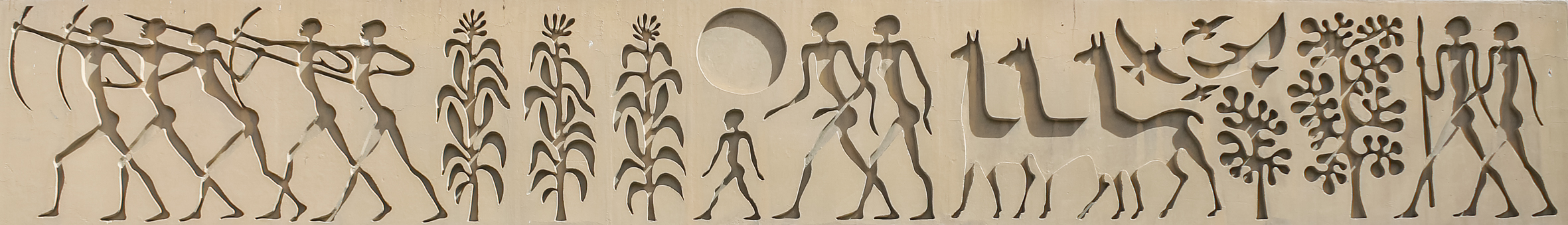 El primer gran mural que realizó son las dos obras que se encuentran en los muros laterales del hall central de la Casa de Gobierno. La temática en el primer panel es la conquista, el éxodo de los indígenas, la adaptación a la tierra, la familia y los animales. En el otro panel aparece la turbina como idea de progreso, los estudiantes, la familia y los obreros.
