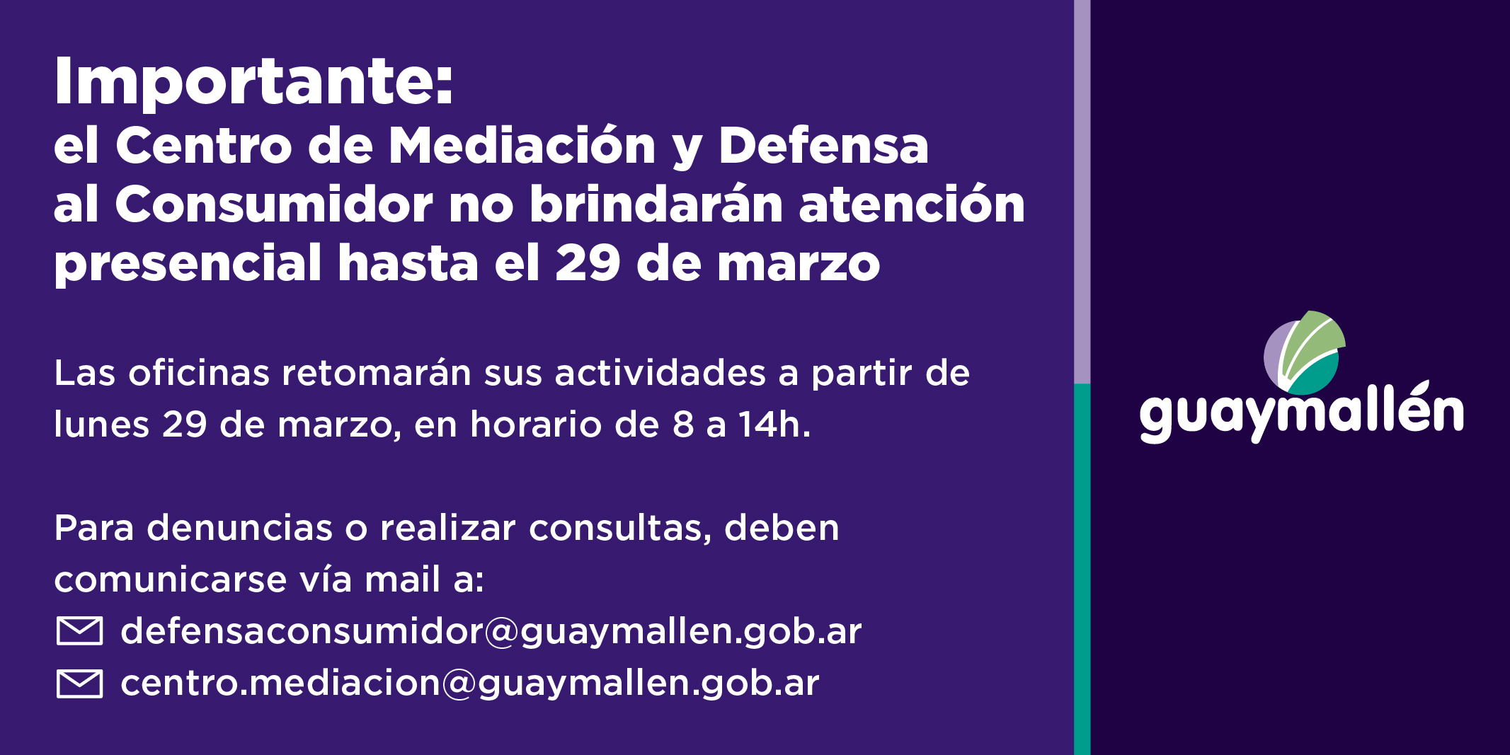 La Municipalidad de Guaymallén informa que, debido a casos positivos de COVID-19, el Centro Comunitario de Mediación y Defensa al Consumidor no brindarán atención presencial al público ni realizarán audiencias. Las oficinas retomarán sus actividades a partir de lunes 29 de marzo, en horario de 8 a 14h. Aquellas personas que necesiten presentar una denuncia o realizar consultas, deben comunicarse vía mail a defensaconsumidor@guaymallen.gob.ar o a centro.mediacion@guaymallen.gob.ar