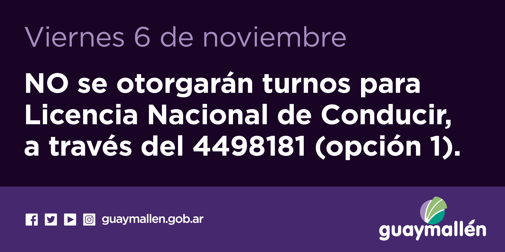 El municipio informa que este viernes 6 de noviembre NO se otorgarán turnos para Licencia Nacional de Conducir a través del 4498181 (opción 1), correspondiente al Servicio de Atención y Mejora Continua. Esto se debe a la ampliación y actualización del sistema que, a partir del lunes 9 de noviembre, incorporará la posibilidad de solicitar turnos en el sitio web guaymallen.gob.ar.