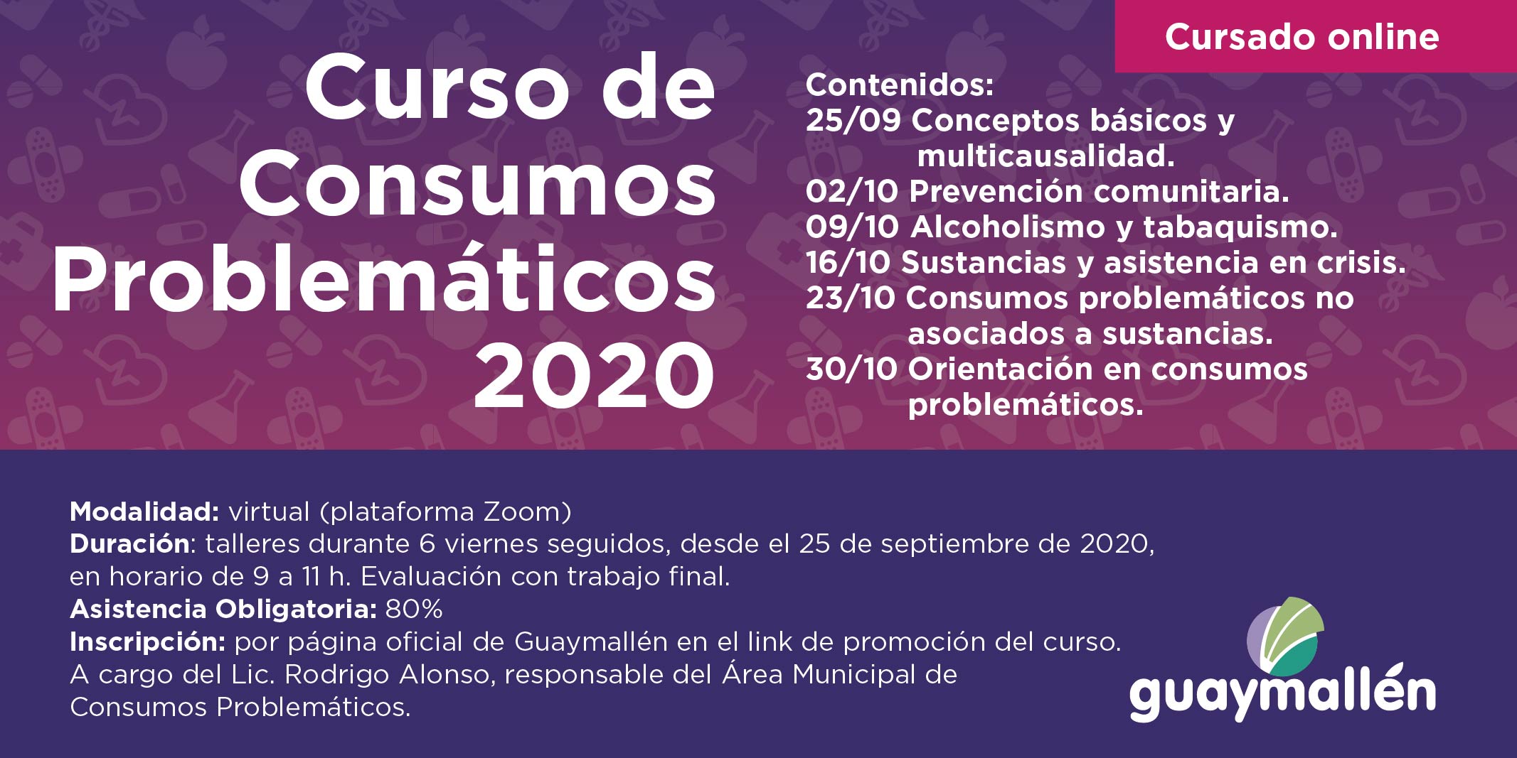 La Municipalidad de Guaymallén invita a participar de una nueva edición del curso de Consumos problemáticos 2020. Este año, y en cumplimiento con las normativas sanitarias vigentes, la capacitación se dictará de forma virtual, a través de la plataforma digital Zoom; y se extenderá durante seis viernes consecutivos, desde el 25 de septiembre hasta el 30 de octubre. El horario de cada encuentro será de 9 a 11h.