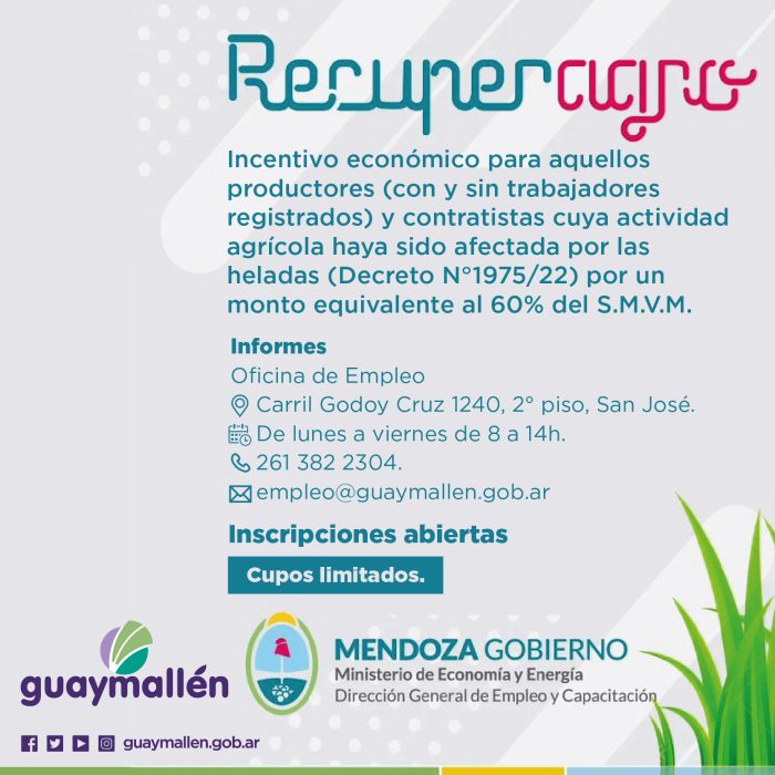 La Municipalidad invita a micros, pequeños y medianos productores agrícolas, contratistas, trabajadores registrados y desocupados de Guaymallén, que se hayan visto afectados por las heladas del pasado mes de noviembre de 2022, a sumarse al Programa Recuperagro, impulsado por la Dirección General de Empleo y Capacitación del Ministerio de Economía y Energía de Mendoza.