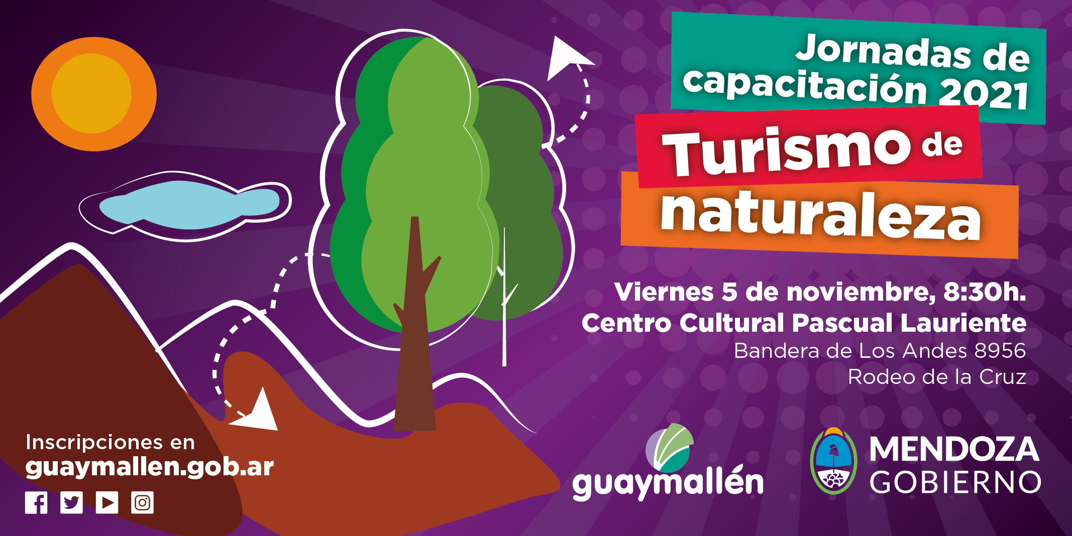 El viernes 5 de noviembre, el Ministerio de Cultura y Turismo de Mendoza y la Municipalidad realizarán una jornada de capacitación sobre Turismo de naturaleza en Guaymallén. El encuentro tendrá lugar en el Centro Cultural Pascual Lauriente (Bandera de Los Andes 8956, Rodeo de la Cruz), comenzará a las 8:30h y se extenderá hasta las 16h. Quienes estén interesados en participar deben completar el formulario de inscripción disponible en https://docs.google.com/forms/d/e/1FAIpQLSeFz_T51F_F-kJoe6S0MFR-2bFnL2R4riQffTClqqDu67Cmug/viewform.