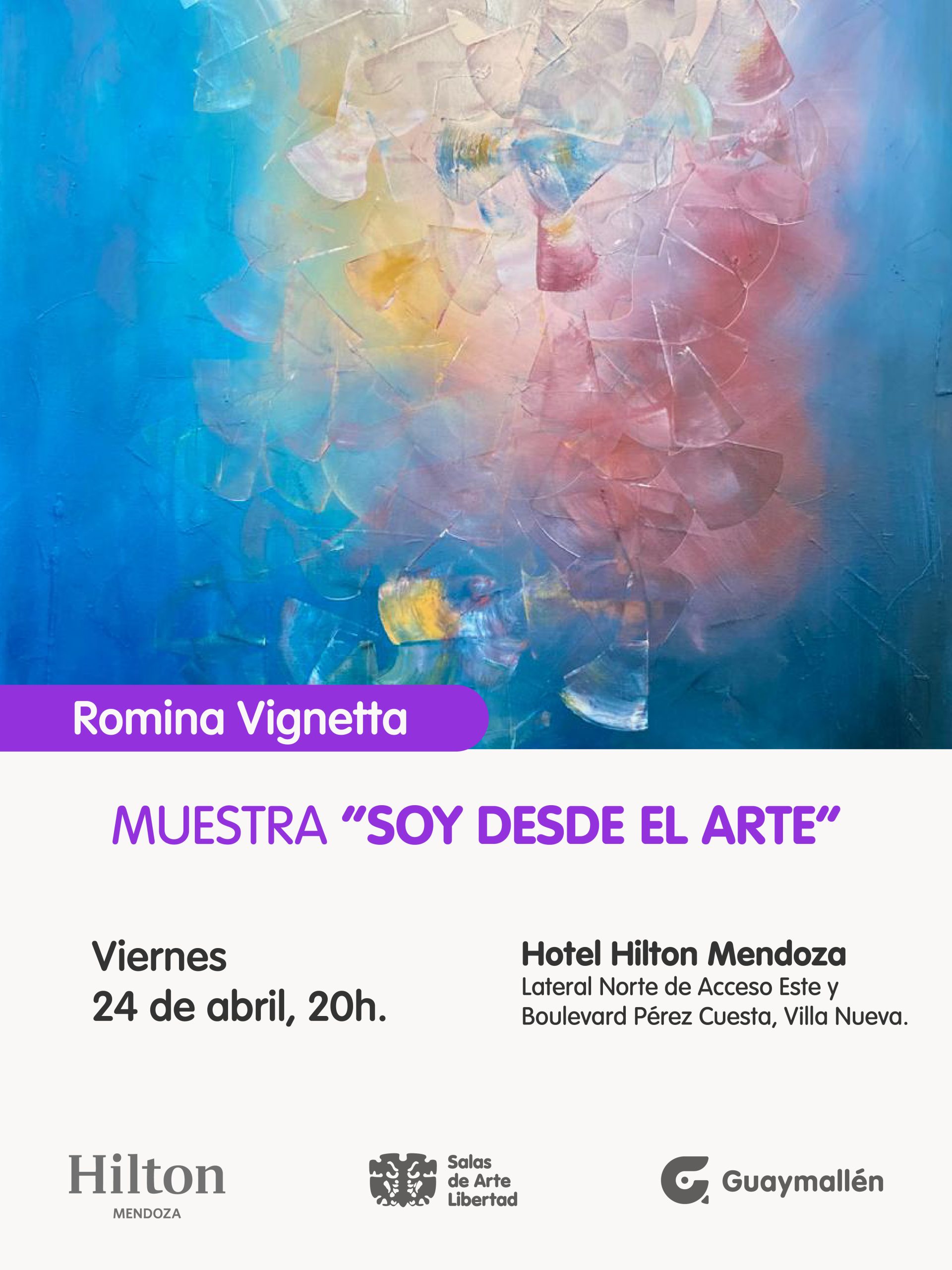 La Municipalidad de Guaymallén invita a vecinos y visitantes a la inauguración de la muestra “Soy desde el arte”, de la artista visual Romina Vignetta. La apertura se realizará el próximo viernes 24 de abril, a las 20h, en el Hotel Hilton Mendoza, con una velada especial que incluirá música en vivo.