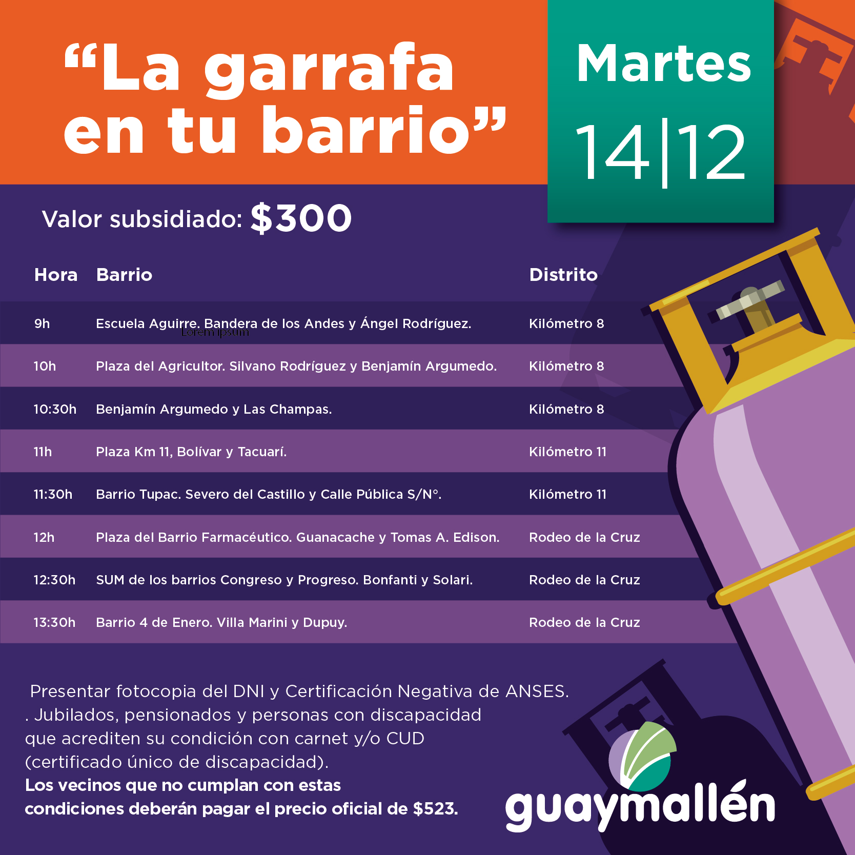 La próxima semana, los vecinos del departamento podrán comprar hasta dos garrafas de 10kg a $300 cada una, a partir de un subsidio municipal. Para acceder a este beneficio, deberán presentar fotocopia del DNI y Certificación Negativa de ANSES. Esta iniciativa también incluye a jubilados, pensionados y personas con discapacidad que acrediten su condición con carnet y/o CUD (certificado único de discapacidad).
